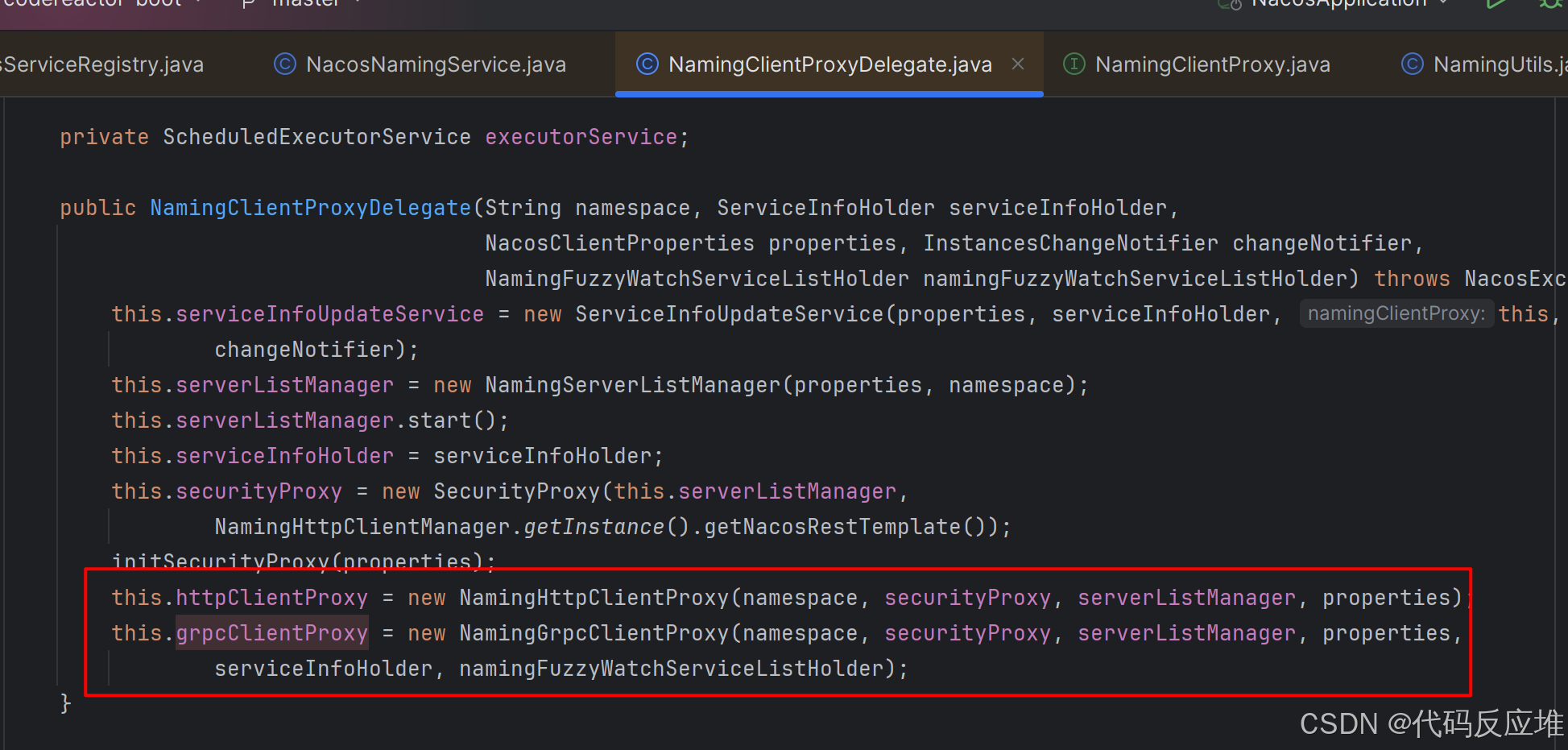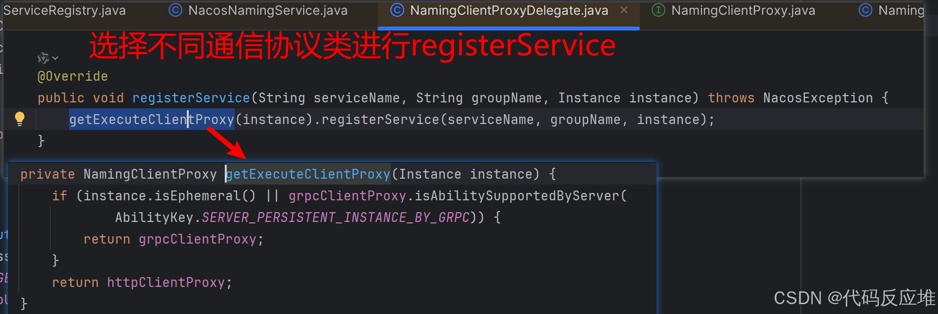 方法进行参数检查后调用clientProxy.registerService方法。clientProxy是NamingClientProxyDelegate类型,它在初始化时会根据实例类型选择不同的通信协议,如下:
