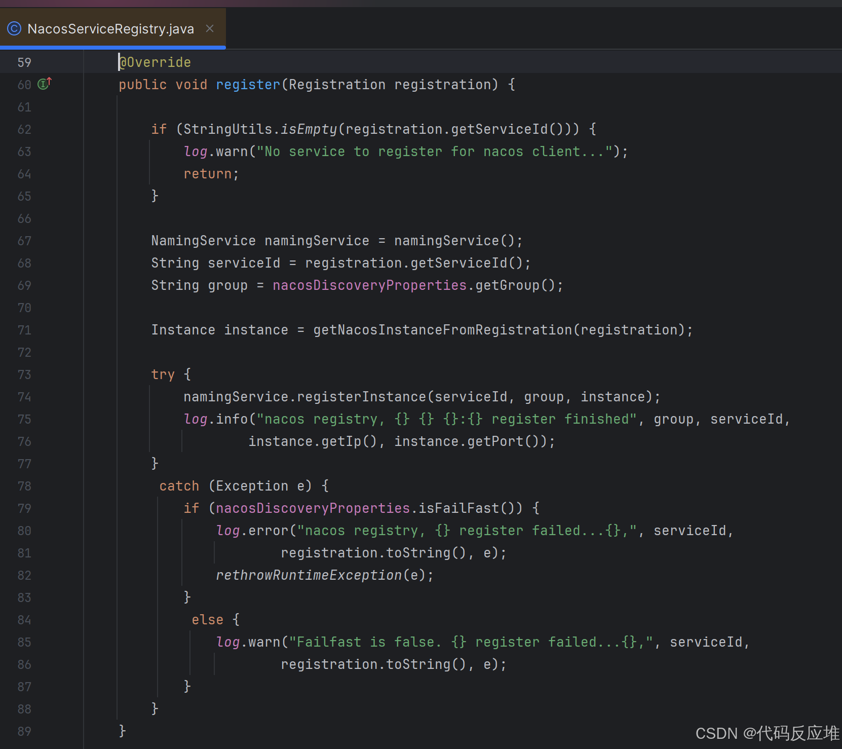 父类的register()方法中调用了NacosServiceRegistry(一开始初始化类传入)的register方法,触发注册逻辑。