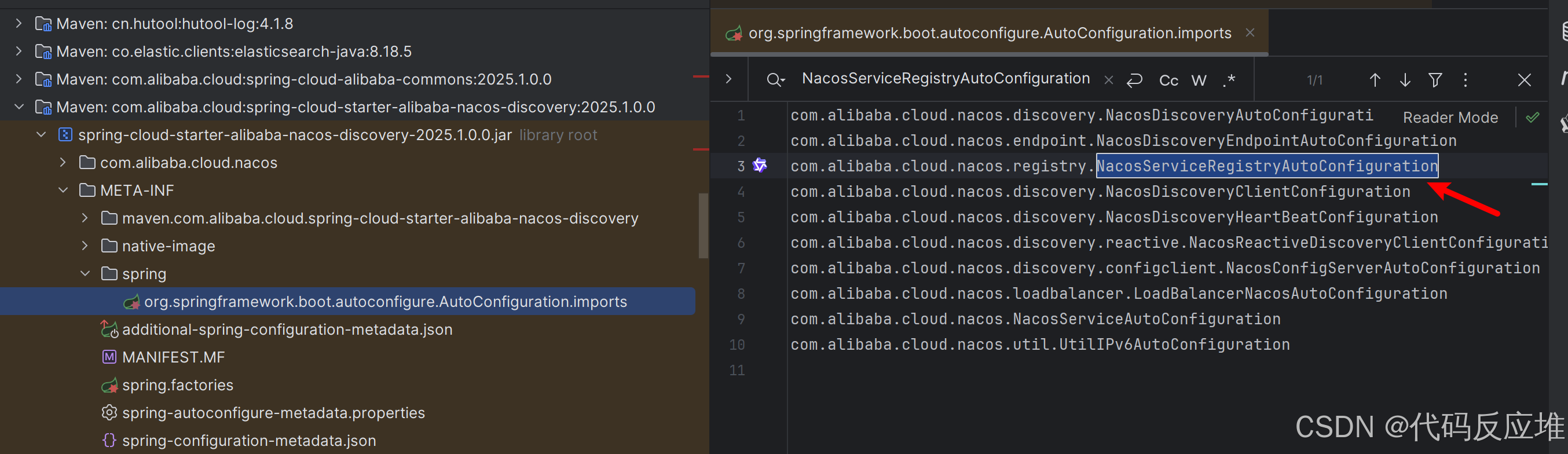 根据Spring Boot自动装配原理,spring-cloud-starter-alibaba-nacos-discovery包下的META-INF/spring/org.springframework.boot.autoconfigure.AutoConfiguration.imports定义了NacosServiceRegistryAutoConfiguration