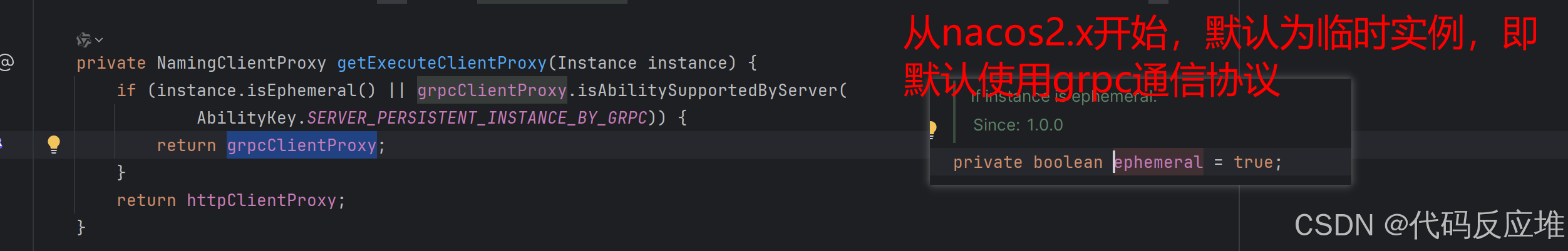 instance.isEphemeral()默认为true,表示临时实例,临时实例对延迟和吞吐量要求更高,使用gRPC基于HTTP/2,支持双向流、多路复用,比HTTP/1.1更适合心跳保活和频繁的注册/注销场景,Nacos 2.x版本开始,临时实例默认使用gRPC协议。