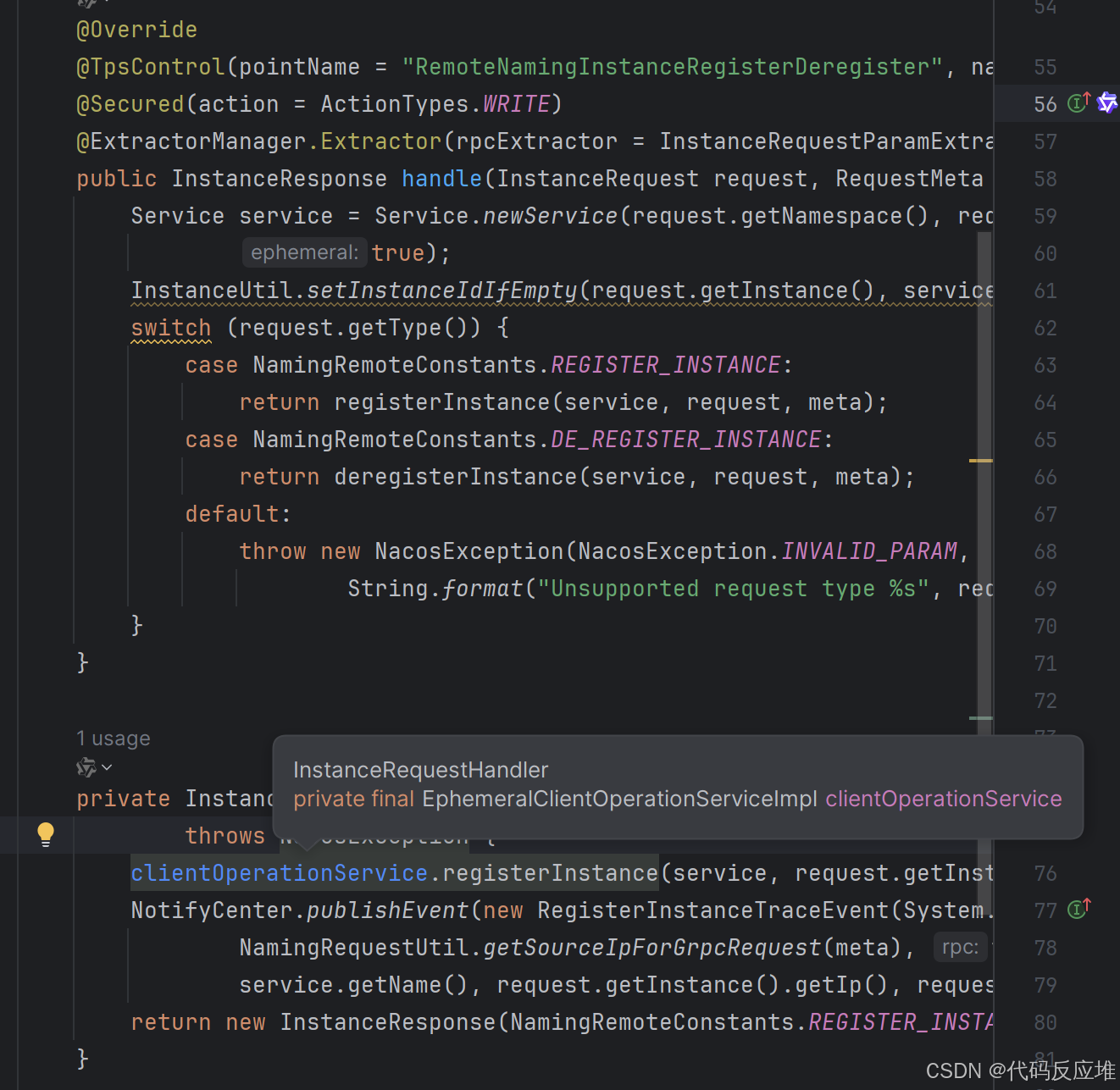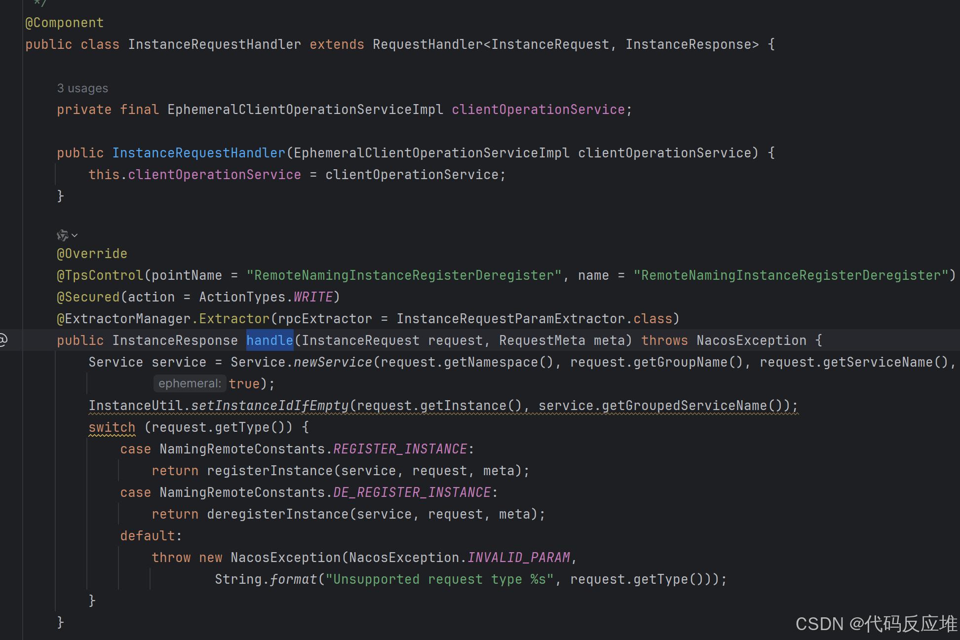 在客户端通过 NamingGrpcClientProxy 发送请求时,服务端对应的方法就是 InstanceRequestHandler.handle()