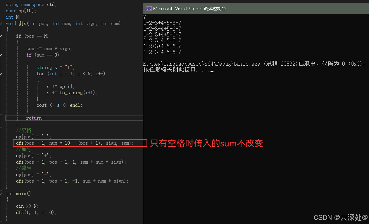 - dfs传入的参数需要有:int整数(从1开始递增),该条件下的number,符号,sum值