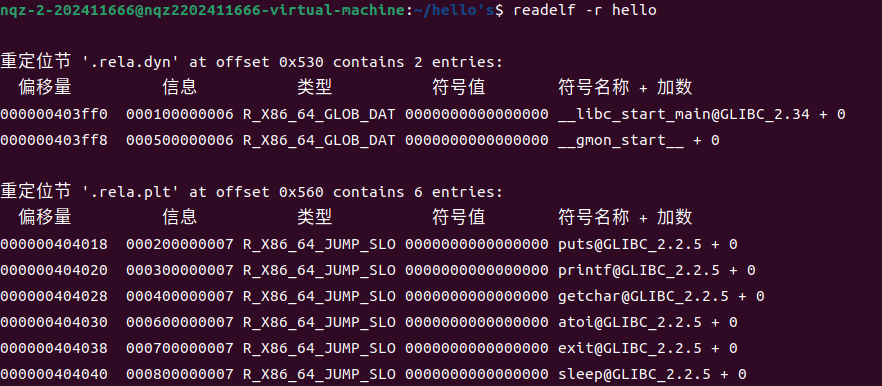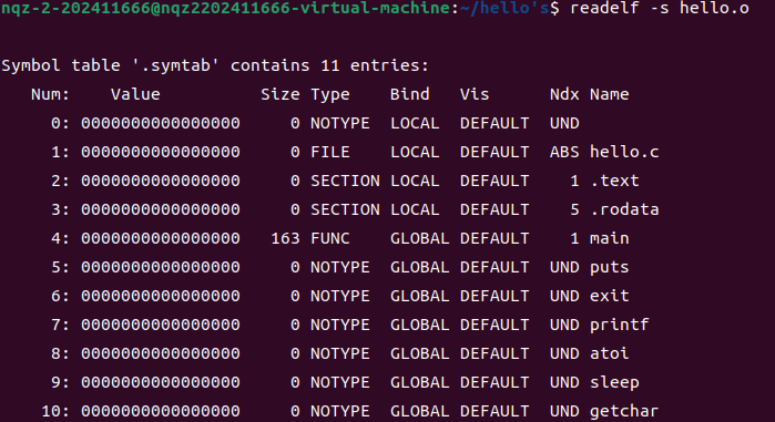 hello.o:可重定位目标文件,包含机器指令但未解决外部符号引用(如printf/sleep)。