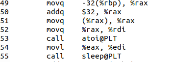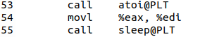 遵循x86-64函数返回值约定:整型返回值存储在%eax 寄存器中,因此atoi的转换结果通过%eax传递给sleep函数。