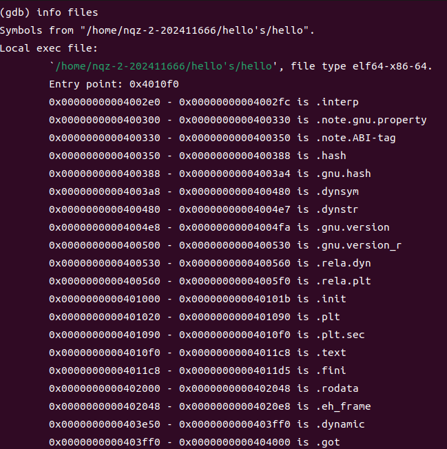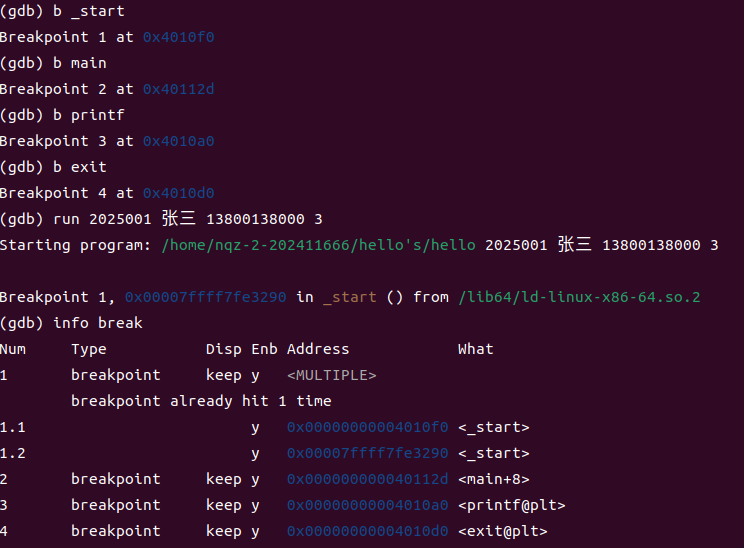 gdb_log.txt:GDB 调试日志,记录hello的执行流程、虚拟地址空间分布。