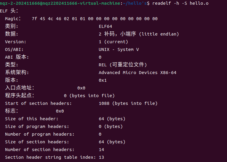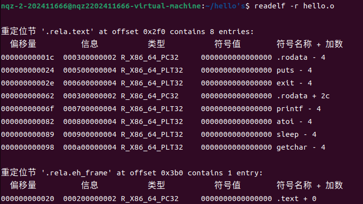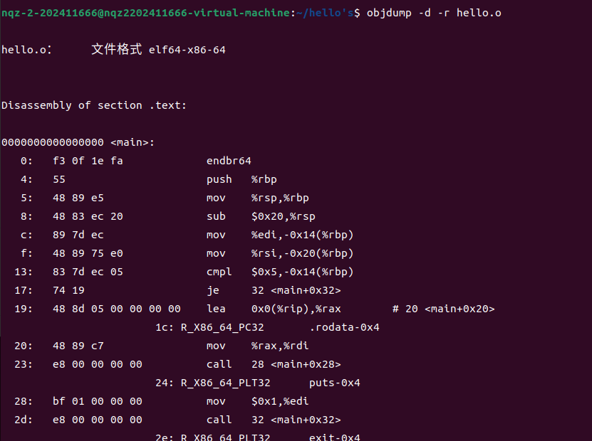 汇编:将汇编指令编码为机器码,生成可重定位目标文件hello.o。