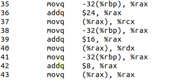 汇编中通过"基址+偏移"寻址模式实现数组访问:-32(%rbp)是argv基地址在栈帧中的存储位置,addq $8, %rax 计算目标元素的地址,(%rax) 是间接寻址,取出该元素指向的字符串首地址。
