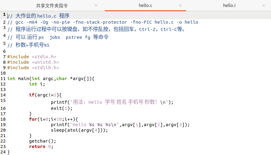 解析:预处理不检查语法错误,仅做文本操作;头文件展开后,printf/sleep/exit/atoi等函数的声明被包含在hello.i中,为后续编译阶段的语法检查提供依据。