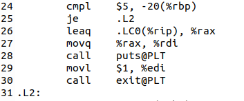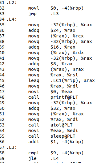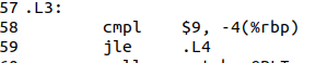 addl 是32位加法指令,源操作数$1是增量,目标操作数-4(%rbp)是i的地址。