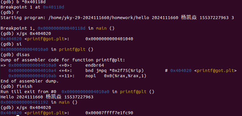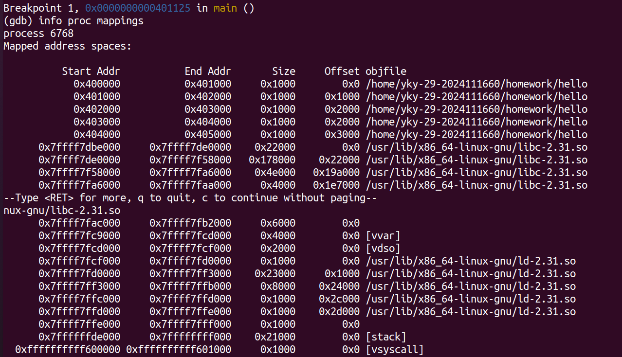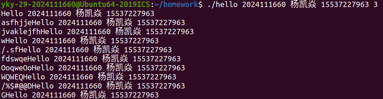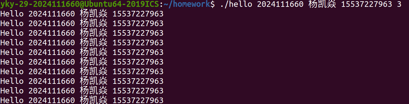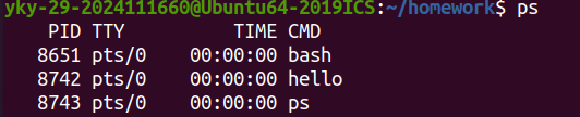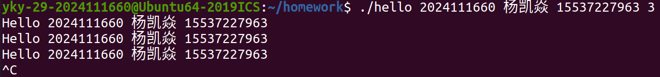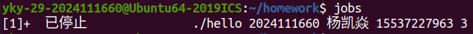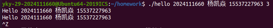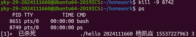 随后,在 Shell中执行 ./hello 学号 姓名 手机号 秒数 命令时,Shell 调用 fork() 创建子进程,并通过 execve() 系统调用加载 hello 可执行文件。操作系统为其分配虚拟地址空间,建立页表映射,将程序段、数据段等载入内存,并跳转至入口点,通常为 _start,最终调用 main 函数。此时,Hello 正式成为一个进程。