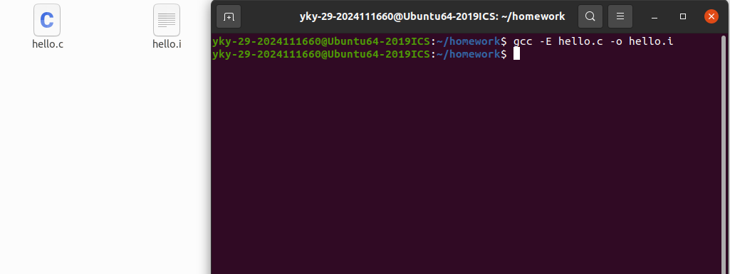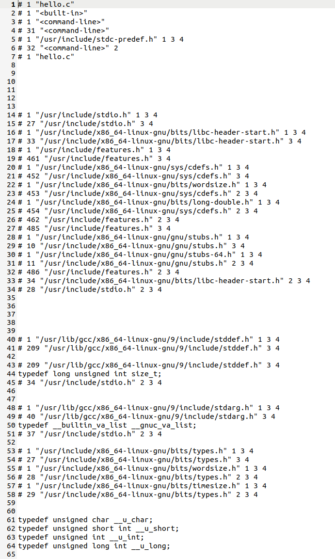 (1)预处理:预处理器处理所有以 # 开头的指令,包括展开 #include <stdio.h> 等头文件、替换宏定义、处理条件编译,并删除注释,最终生成扩展名为 .i 的预处理文件 hello.i。