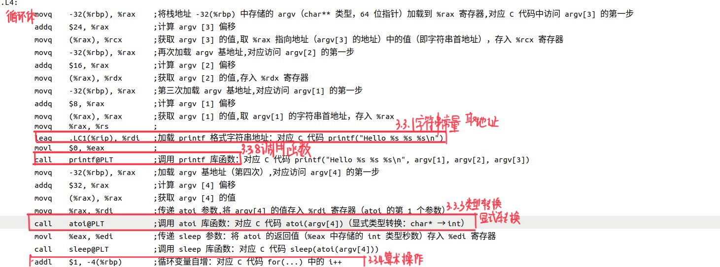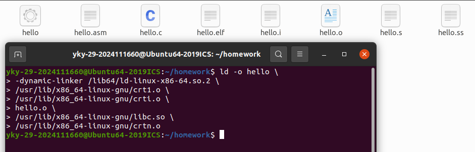 (4)链接:链接器将 hello.o 与 C 标准库(如 libc 中的 printf、sleep、atoi 等函数实现)进行符号解析与地址重定位,最终生成完整的可执行文件hello.out。
