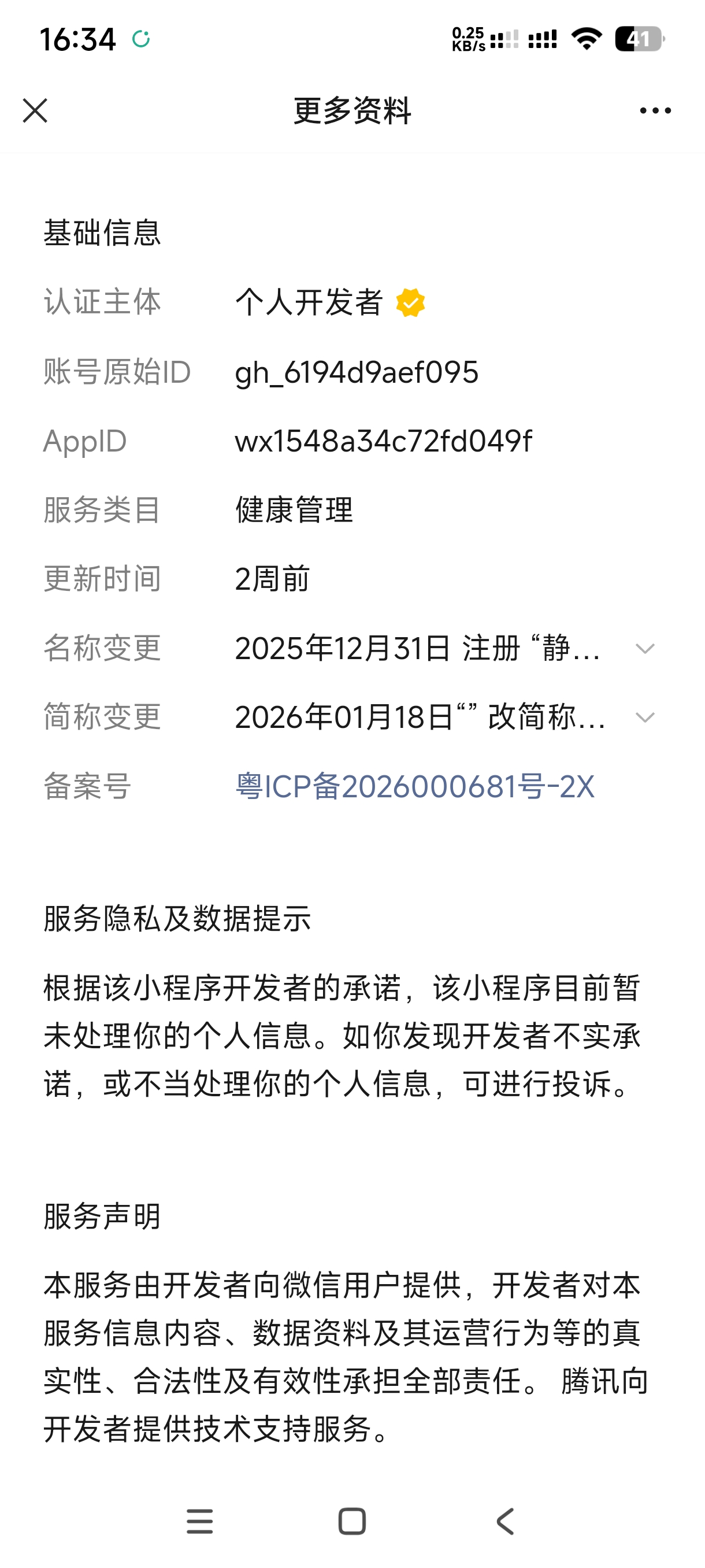 打开小程序→右上角 "···"→点击小程序名称进入资料页→点击箭头,即可查看资料详情,即可看到备案号