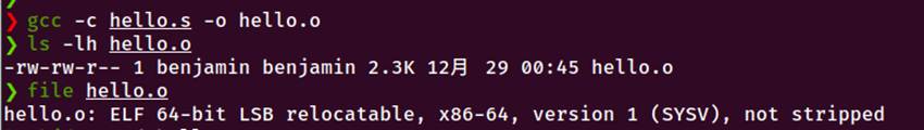 4.汇编:gcc -c 将汇编代码转换为机器指令,生成hello.o