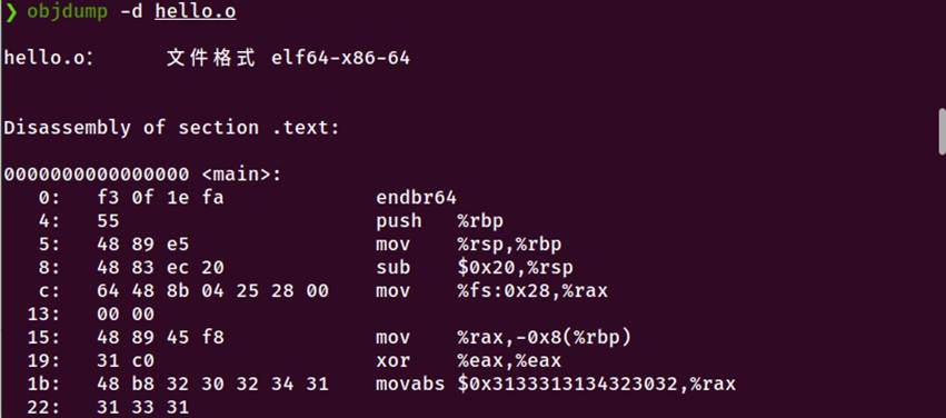 汇编阶段:gcc -c将汇编代码转换为机器码,生成可重定位目标文件hello.o
