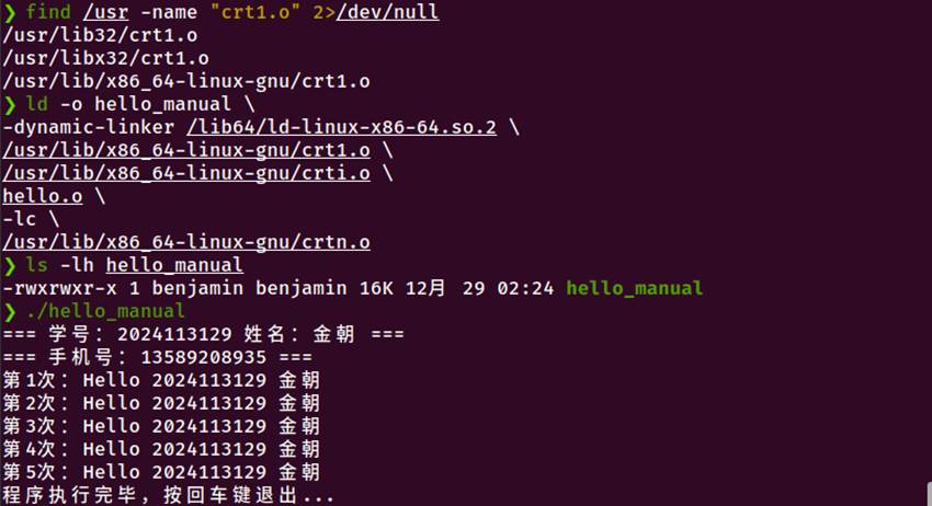 链接阶段:gcc链接hello.o与C库,解析符号引用,生成可执行文件hello