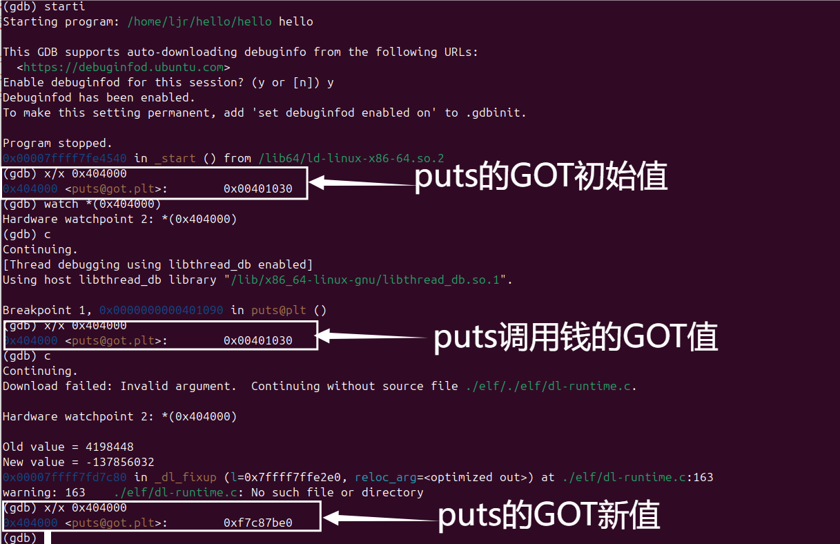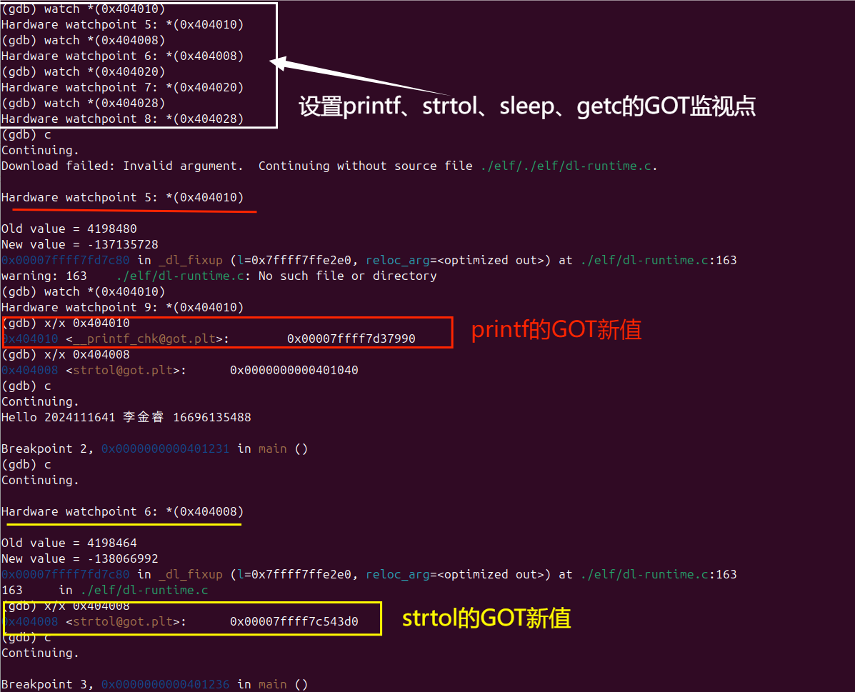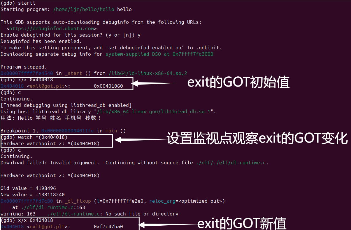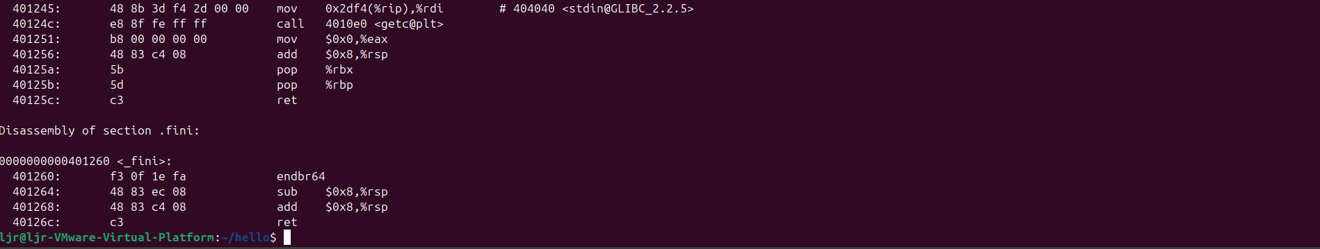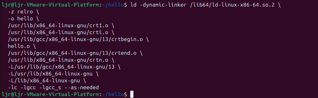 | hello | 链接后最终生成的可执行文件,可直接在系统中运行,用于分析ELF可执行文件格式、虚拟地址空间和动态链接行为。 |
