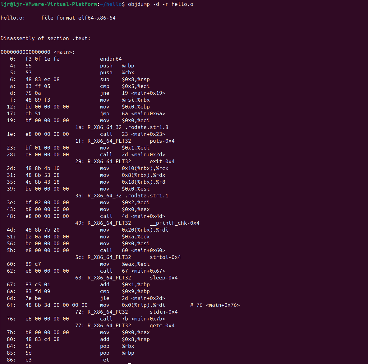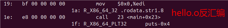 | hello_o_disassembled.txt | 通过objdump -d -r hello.o生成的文件,包含hello.o中代码节(.text)的反汇编结果及重定位信息。用于分析第4章"汇编"阶段,展示机器码与汇编指令的对应关系、重定位条目的具体内容,为理解链接前的可重定位目标文件状态提供关键数据。 |
