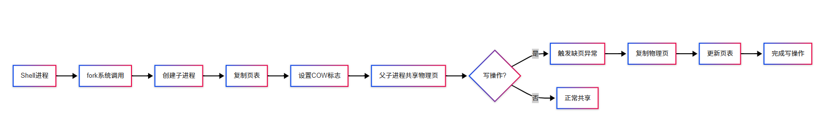 当Shell调用fork()创建Hello进程时:先创建进程控制块,复制父进程(Shell)的PCB,分配新的PID;虚拟地址空间复制采用写时复制技术,父子进程共享相同的物理页框,页表条目标记为只读,当任一进程尝试写入时,触发页错误,操作系统复制物理页;页表复制复制父进程的页表结构,页表条目指向相同的物理页框,设置COW标志。