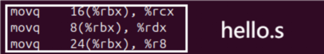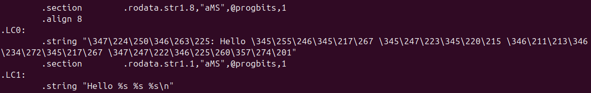 | hello.s | 编译生成的汇编语言文件,展示了C代码如何被转换为x86-64汇编指令,用于分析编译优化与代码生成。 |