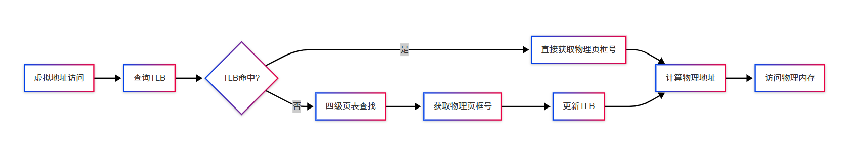 进程执行时,CPU发出的虚拟地址经由MMU转换。在x86-64 Linux中,分段机制被简化为平坦模型,线性地址等于偏移量。通过四级页表和TLB缓存,虚拟地址被转换为物理地址。内存访问进一步经过L1/L2/L3缓存层次优化。fork时采用写时复制优化内存使用;execve时建立全新的地址空间映射。