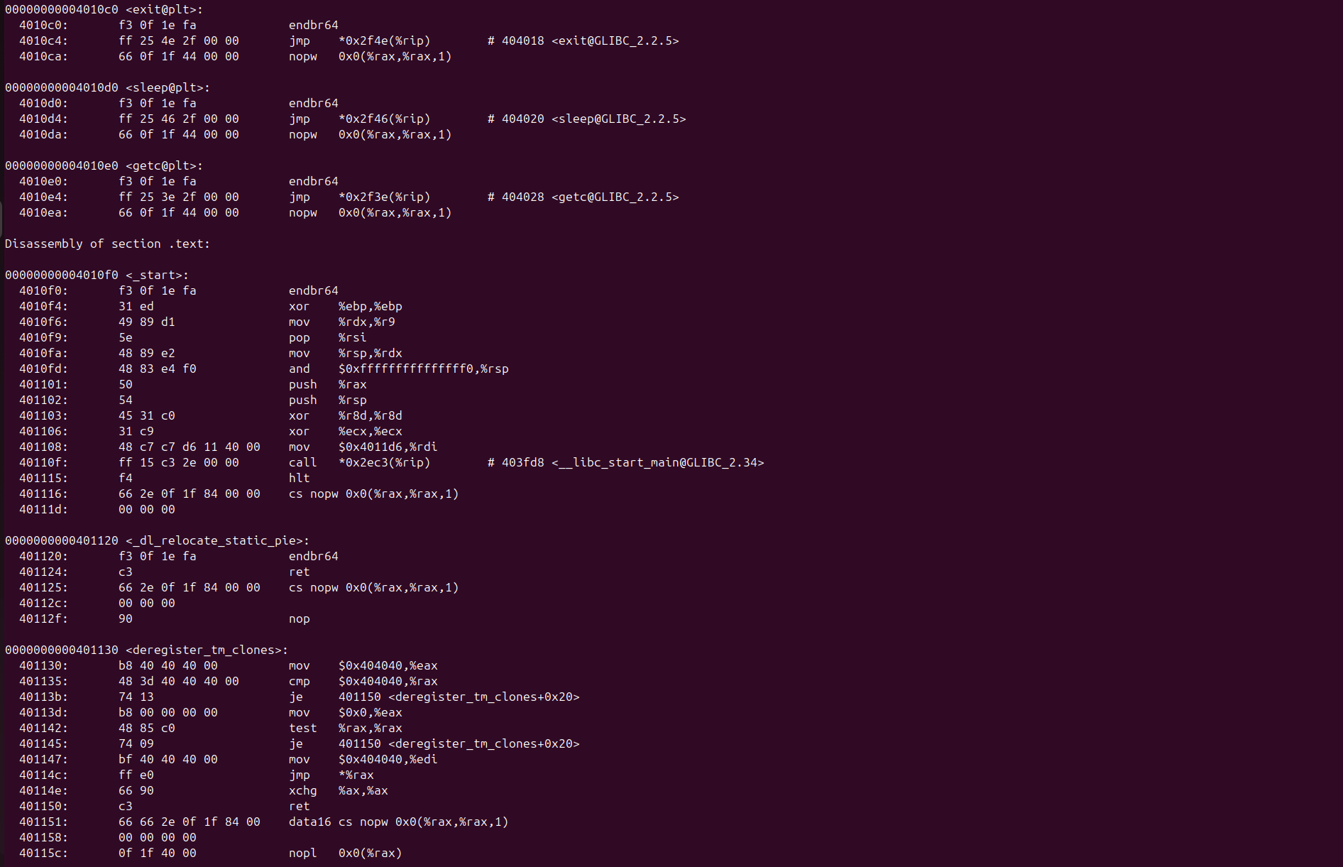 | hello_all_disassembled.txt | 通过objdump -D hello生成的文件,包含可执行文件hello中所有节区(包括代码段、数据段、只读数据段、动态链接信息等)的完整反汇编。用于分析第5章"链接"阶段,展示链接后各节区的最终内存布局、地址绑定结果,以及代码与数据混合的完整二进制映像。 |
