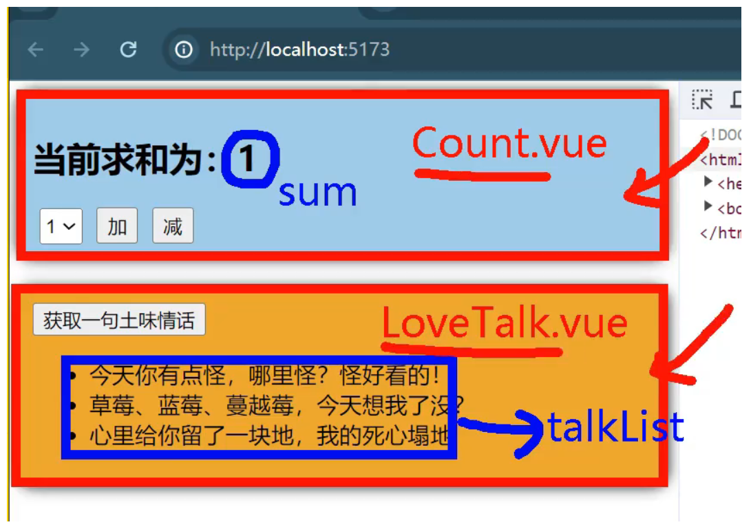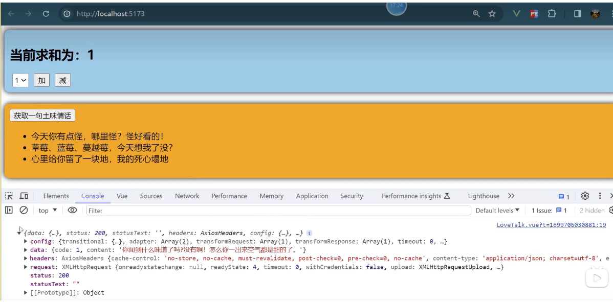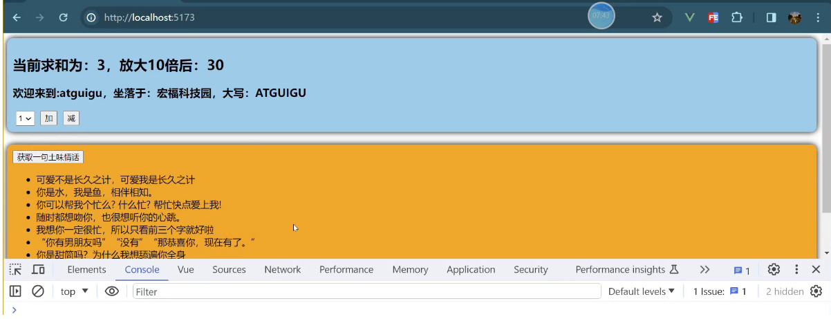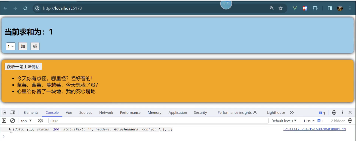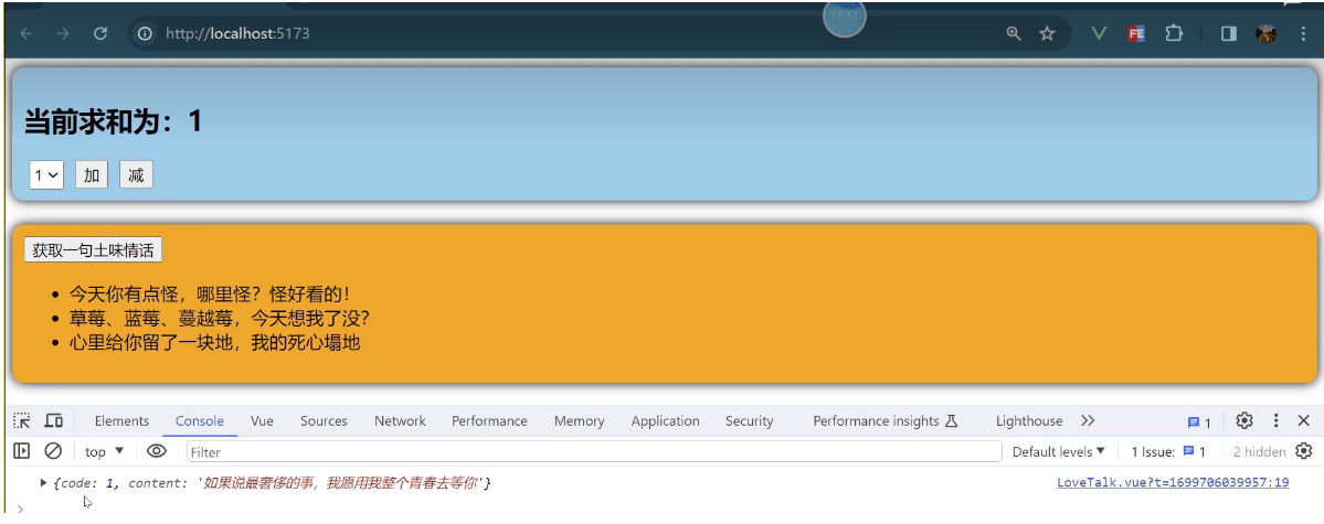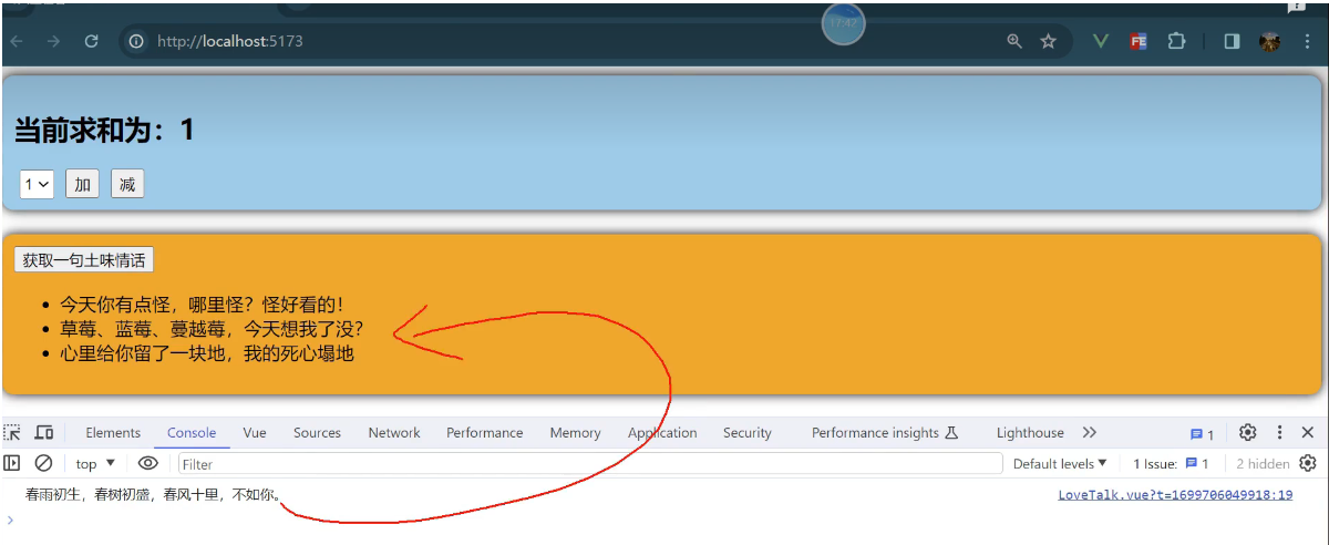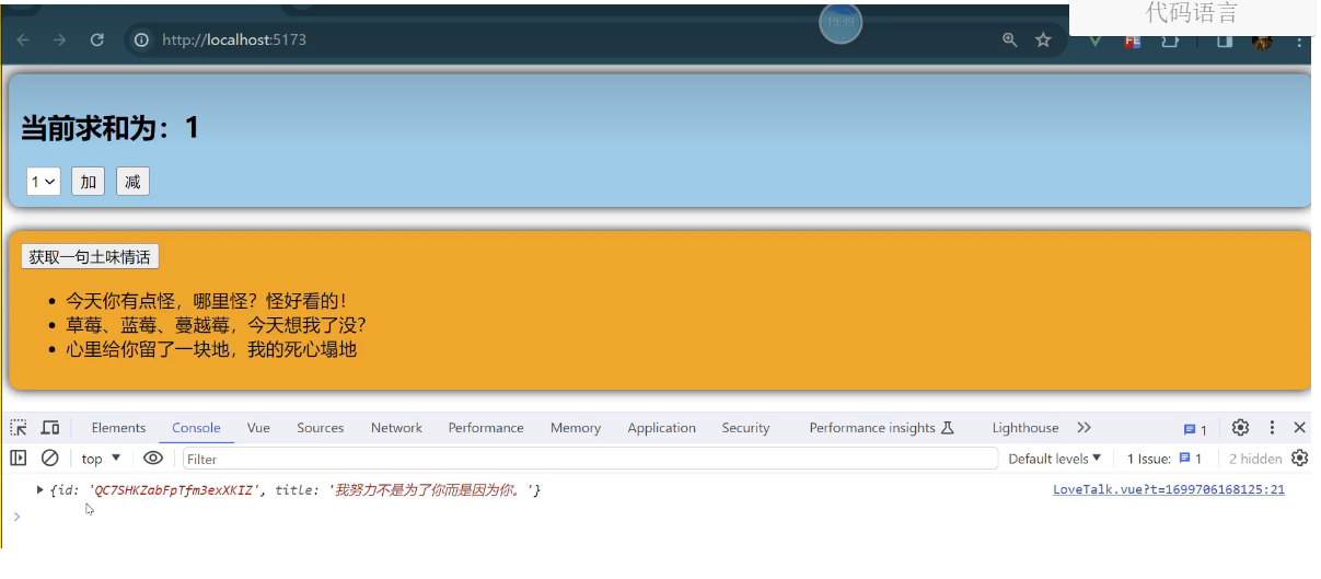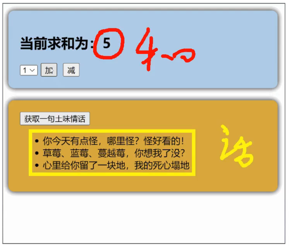 一个组件保存求和的值,一个组件保存着获取一句土味情话