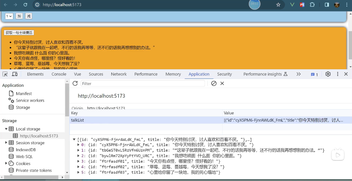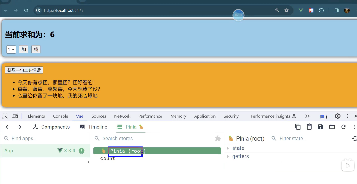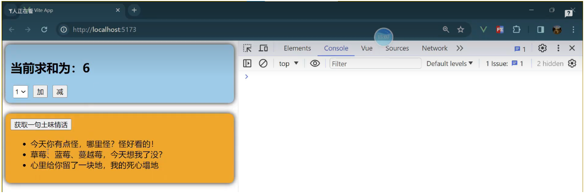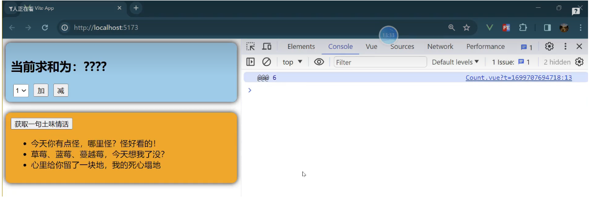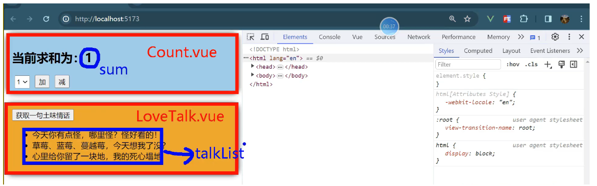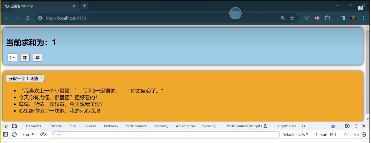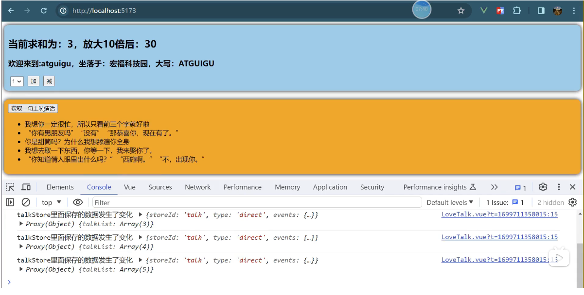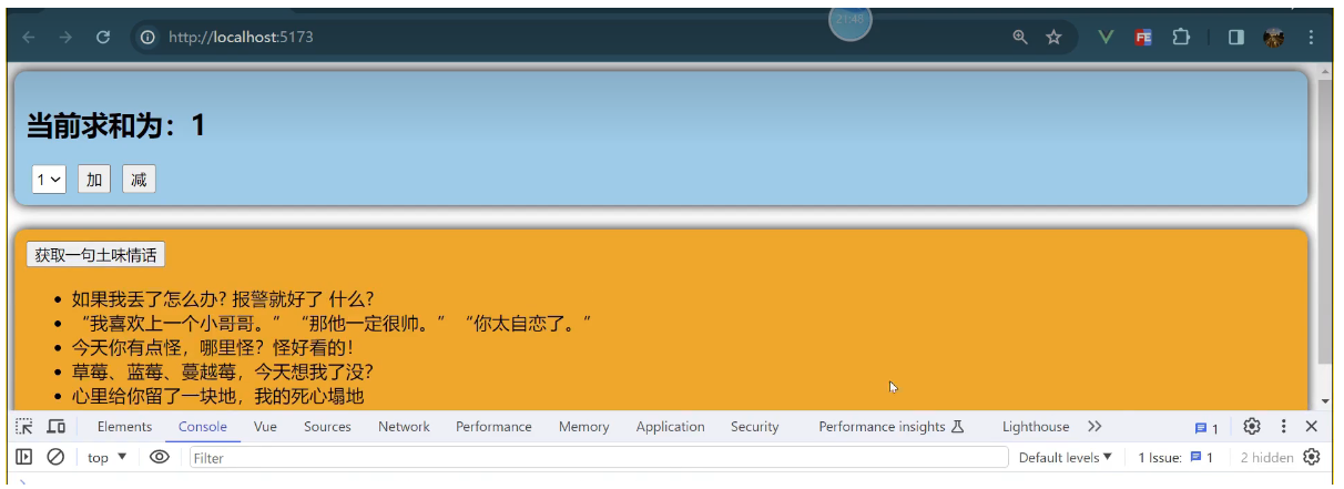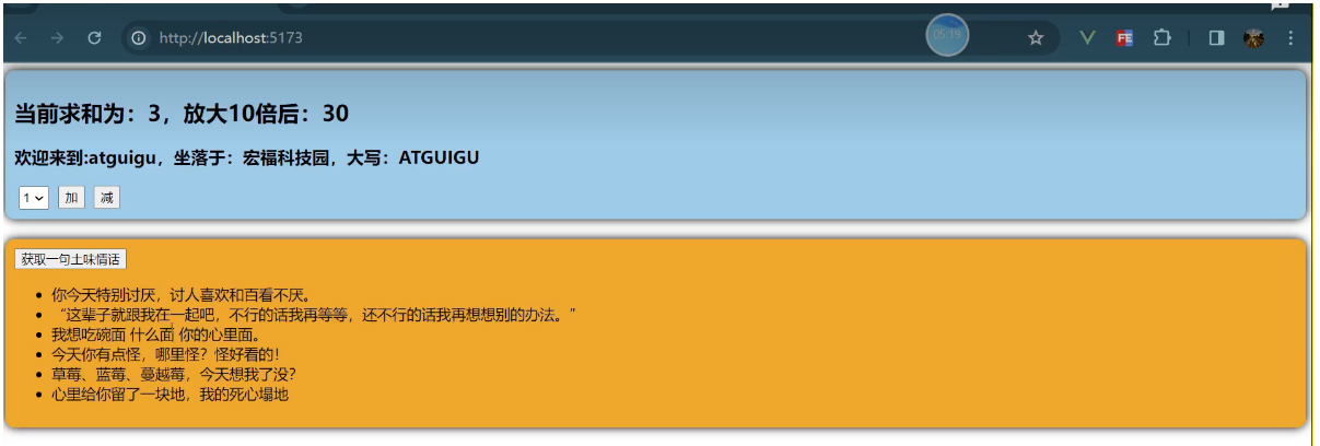 一个组件保存求和的值,一个组件保存着获取一句土味情话