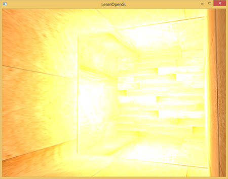 这里场景的颜色值存在一个可以包含任意颜色值的浮点颜色缓冲中,值可能是超过1.0的。这个简单的演示中,场景被创建为一个被拉伸的立方体通道和四个点光源,其中一个非常亮的在隧道的尽头:
