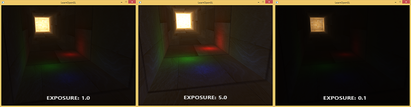 在这里我们将 exposure 定义为默认为1.0的 uniform ,从而允许我们更加精确设定我们是要注重黑暗还是明亮的区域的HDR颜色值。举例来说,高曝光值会使隧道的黑暗部分显示更多的细节,然而低曝光值会显著减少黑暗区域的细节,但允许我们看到更多明亮区域的细节。下面这组图片展示了在不同曝光值下的通道: