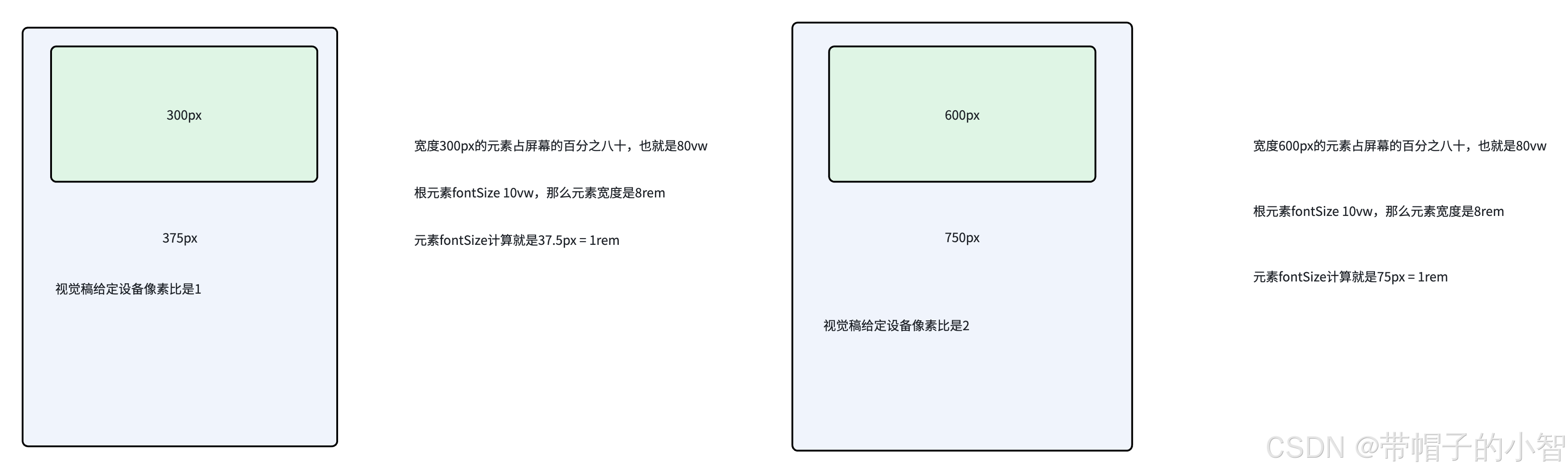 同等分辨率的情况,设备像素比越高,css逻辑分辨率越低,相同的css像素占据更多物理空间,视觉效果偏大。