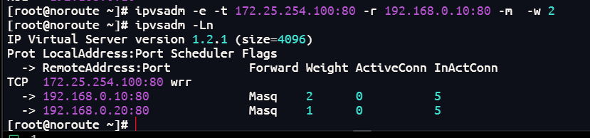 ipvsadm -e -t 172.25.254.100:80 -r 192.168.0.10:80 -m -w 2