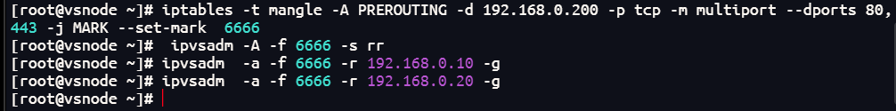 为了防止轮询错误,使用火墙标记访问vip的80和443的所有数据包,设定标记为6666,然后对此标记进行负载