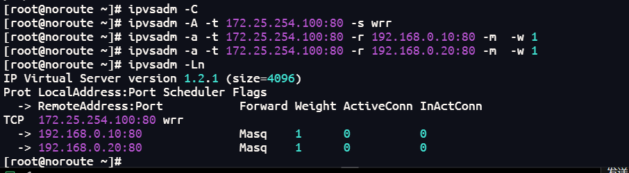 ipvsadm -a -t 172.25.254.100:80 -r 192.168.0.10:80 -m -w 1