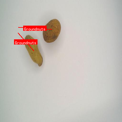 这张图片呈现了花生检测与识别任务的典型场景。画面背景为纯白色,无多余干扰元素,视觉焦点集中于中心的红色物体及标注文字。该红色物体呈不规则椭圆形,表面纹理粗糙,颜色为深红棕色,符合花生的形态特征;其上方覆盖着红色矩形标签,标签内用白色字体清晰标注"Groundnuts"(英文中"花生"的常用表述)。从任务目标看,此图是花生检测与识别流程的基础素材------背景的简洁性便于算法提取目标特征,物体的形态、颜色及标注文字则为模型训练提供了明确的样本标识,帮助系统学习"花生"这一目标的视觉特征(如形状、色彩、纹理),进而实现后续对复杂场景中花生的自动检测与分类。整体而言,图片通过简洁的场景设计,精准服务于花生检测与识别的技术需求,是算法训练或测试环节的有效示例。