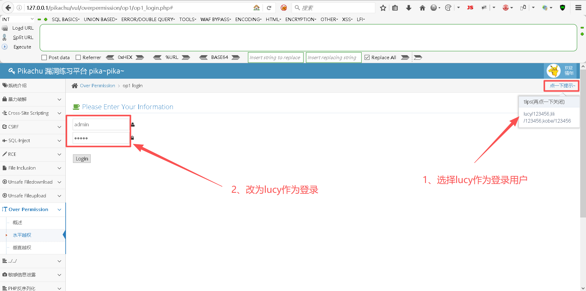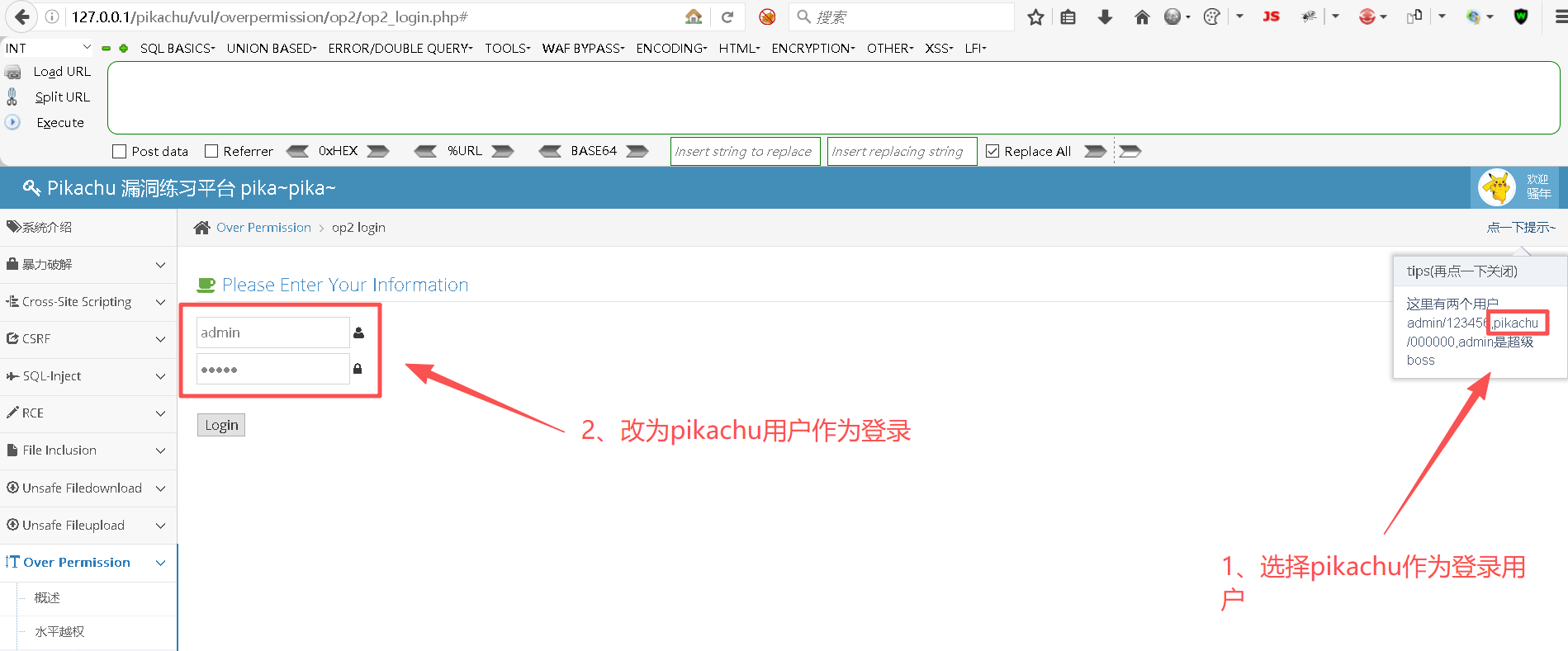 http://127.0.0.1/pikachu/vul/overpermission/op2/op2_login.php