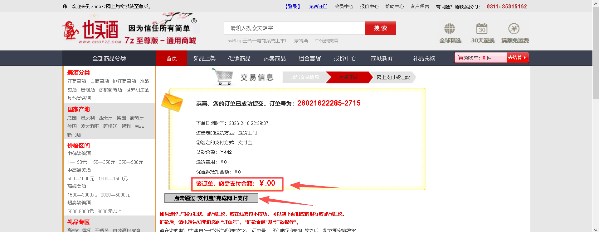 Step5:在支付页面中看到需支付零元,并点击按钮为"点击通过"支付宝"完成网上支付"