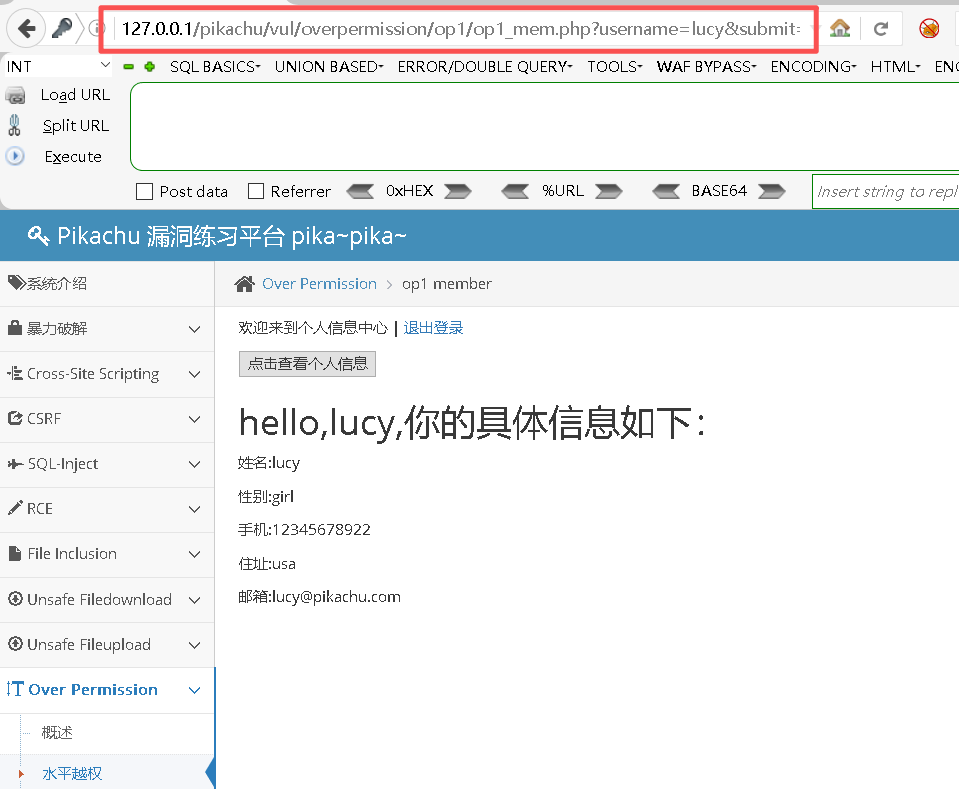 http://127.0.0.1/pikachu/vul/overpermission/op1/op1_mem.php?username=lucy&submit=点击查看个人信息