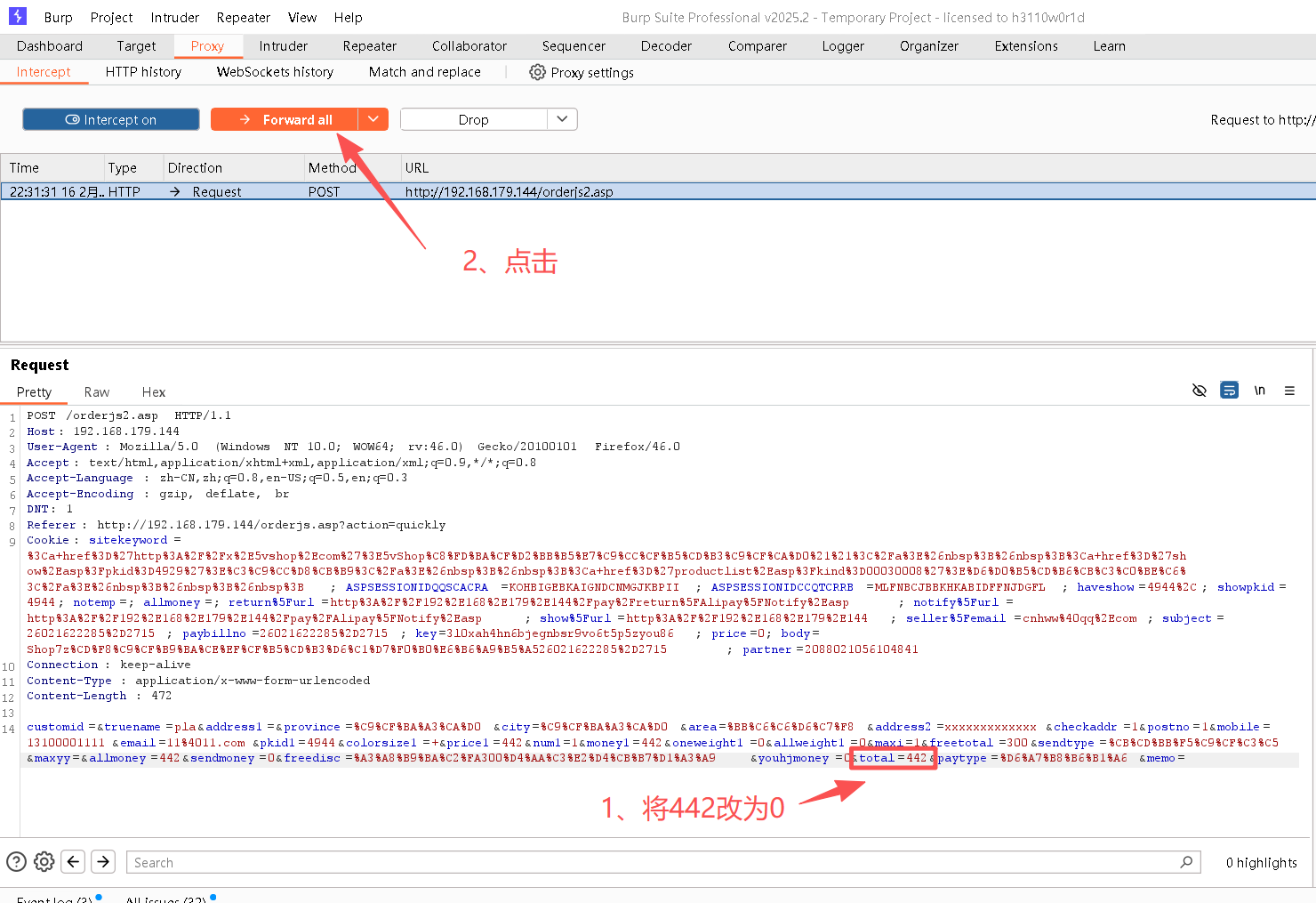 Step2:在BurpSuite中开启"intercept on";并开启浏览器的代理