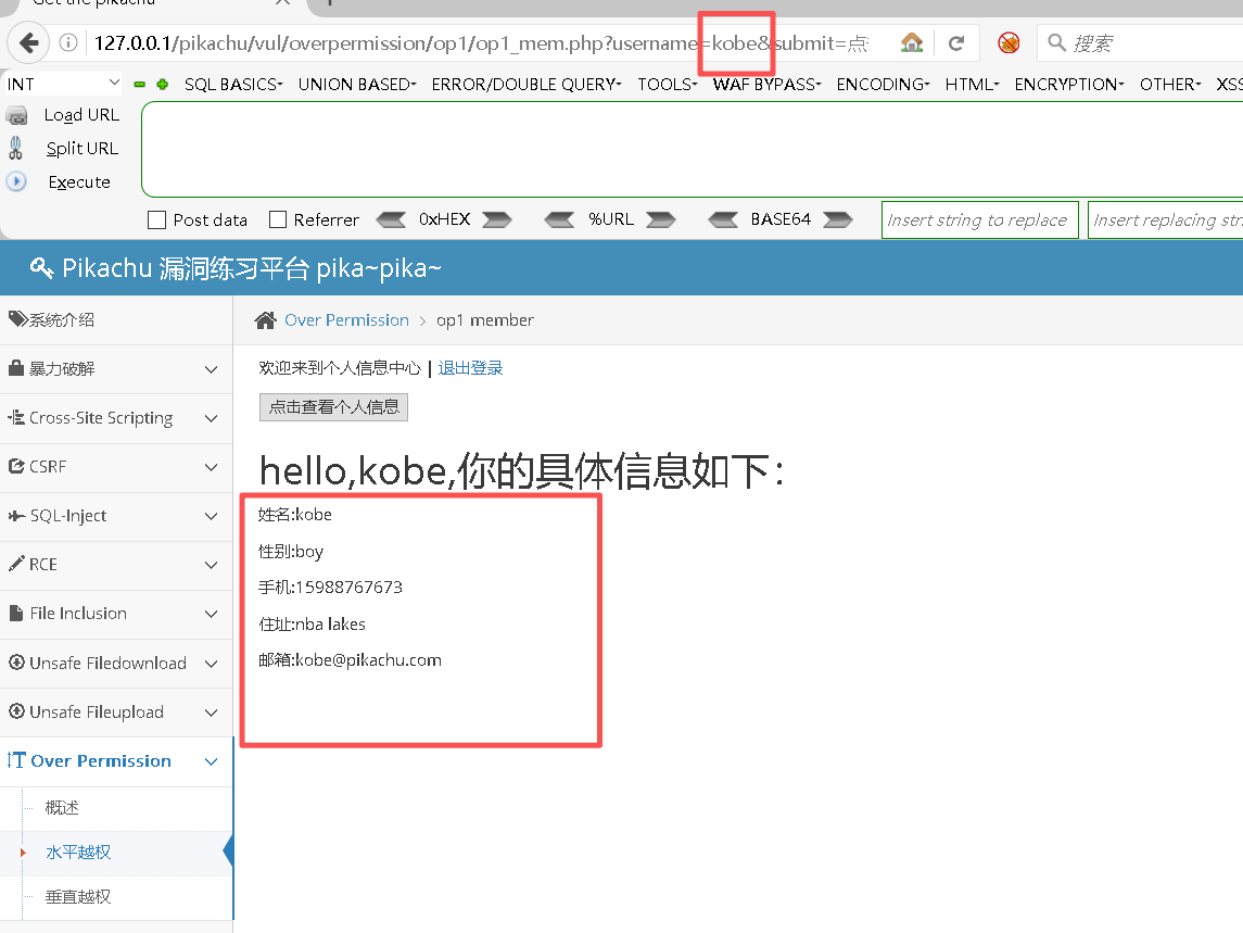 http://127.0.0.1/pikachu/vul/overpermission/op1/op1_mem.php?username=kobe&submit=点击查看个人信息