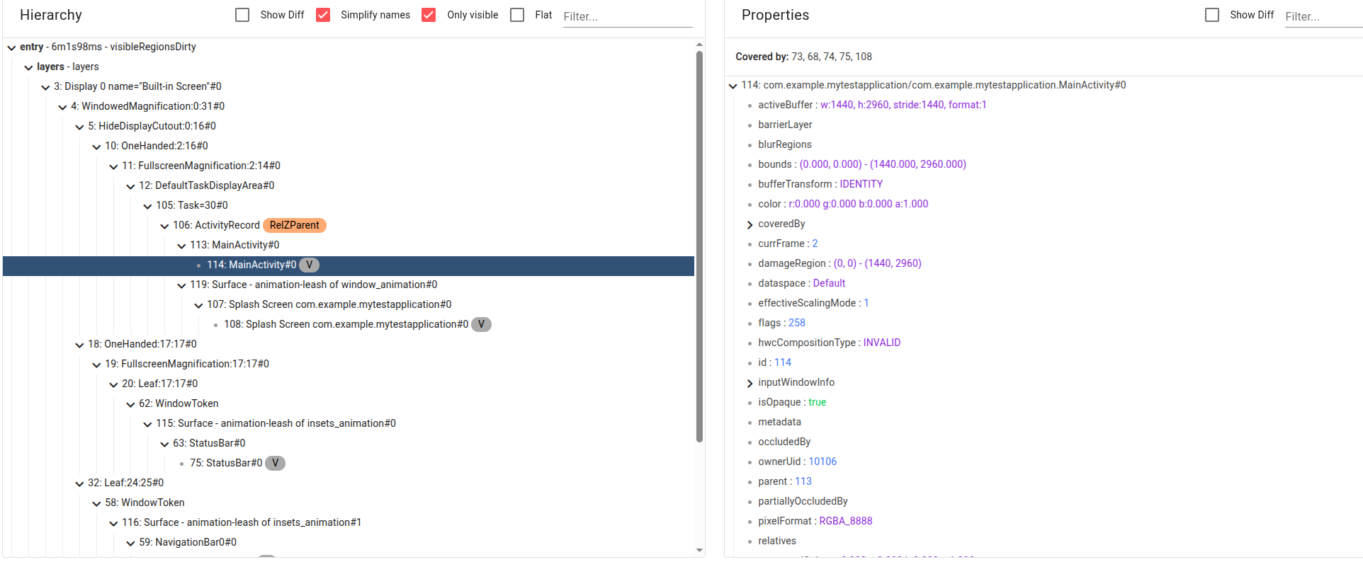 D Test111 : ActivityRecord{5297b65 u0 com.example.mytestapplication/.MainActivity t11} add child Window{c52dc92 u0 Splash Screen com.example.mytestapplication}