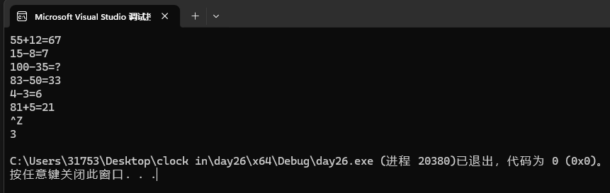 你的弟弟刚做完了"100以内数的加减法"这部分的作业,请你帮他检查一下。每道题目(包括弟弟的答案)的格式为a+b=c或者a-b=c,其中a和b是作业中给出的,均为不超过100的非负整数;c是弟弟算出的答案,可能是不超过200的非负整数,也可能是单个字符"?",表示他不会算。输入文件包含不超过100行,以文件结束符结尾。每行包含一道题目,格式保证符合上述规定,且不包含任何空白字符。输入的所有整数均不含前导0。