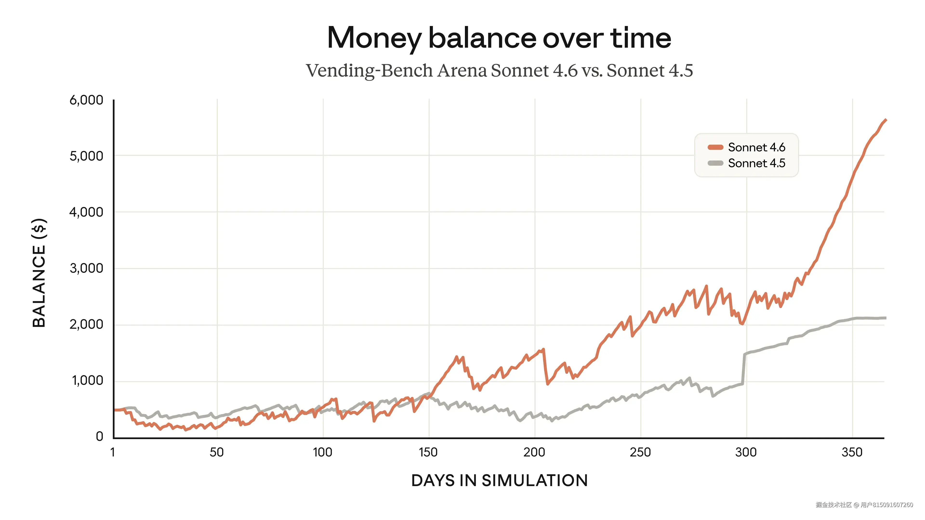 (图示:Sonnet 4.6 通过早期投资与后期盈利策略超过 Sonnet 4.5)