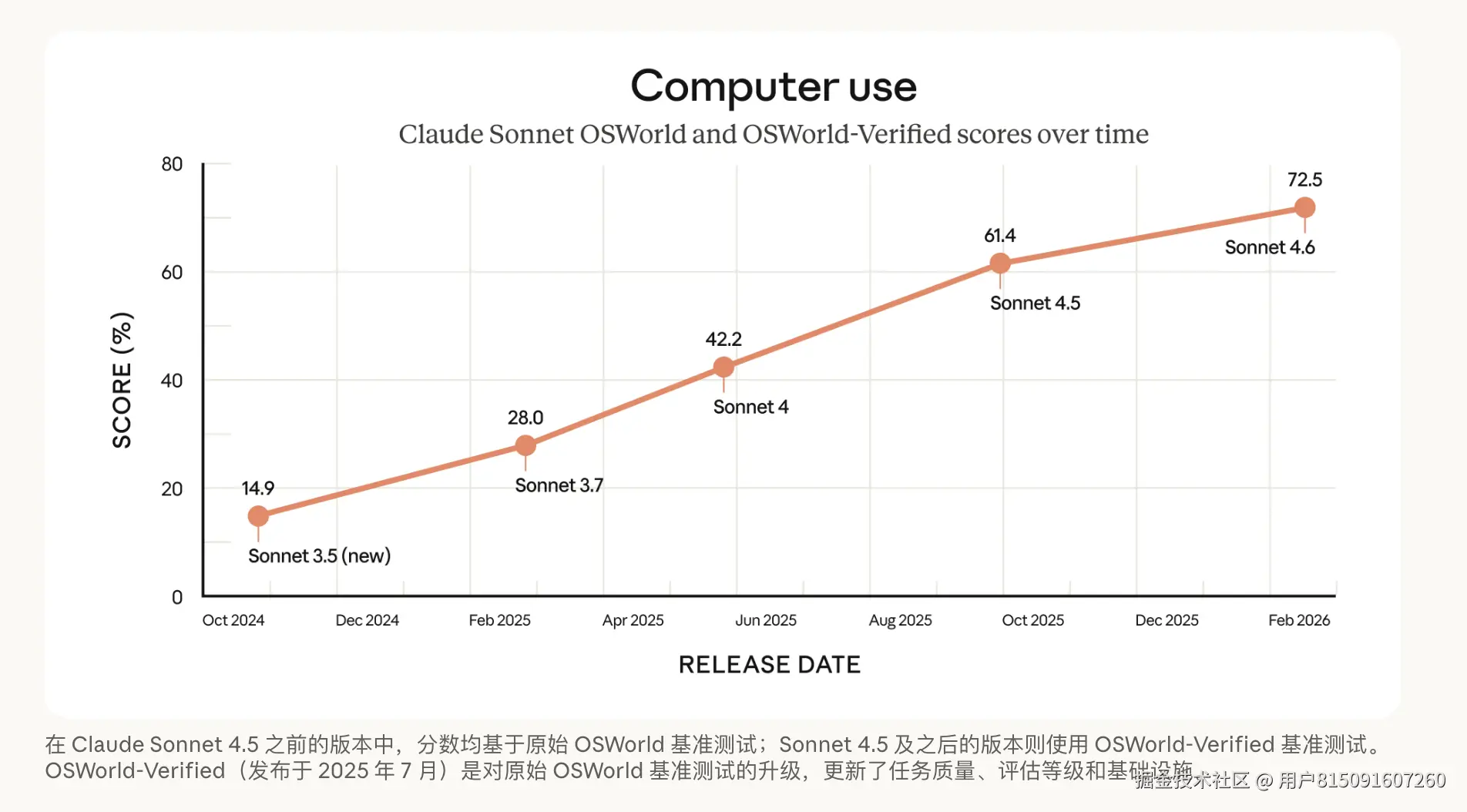 Sonnet 4.5 之前的分数基于原版 OSWorld;4.5 之后使用 OSWorld-Verified(2025 年 7 月发布,对任务质量、评分与基础设施进行了升级)。