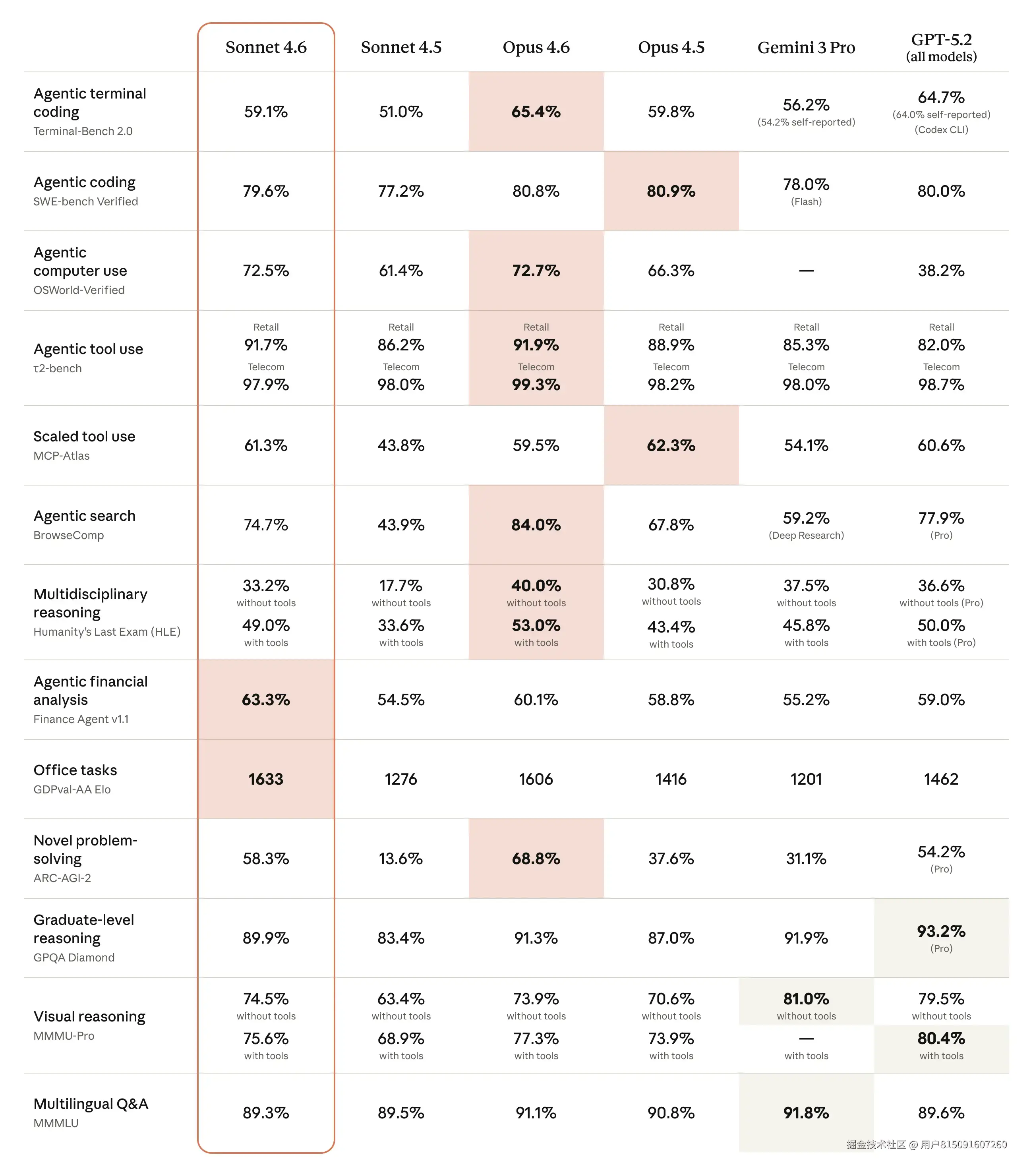 (表格:主流基准中 Sonnet 4.6 相对于其他前沿模型的表现)