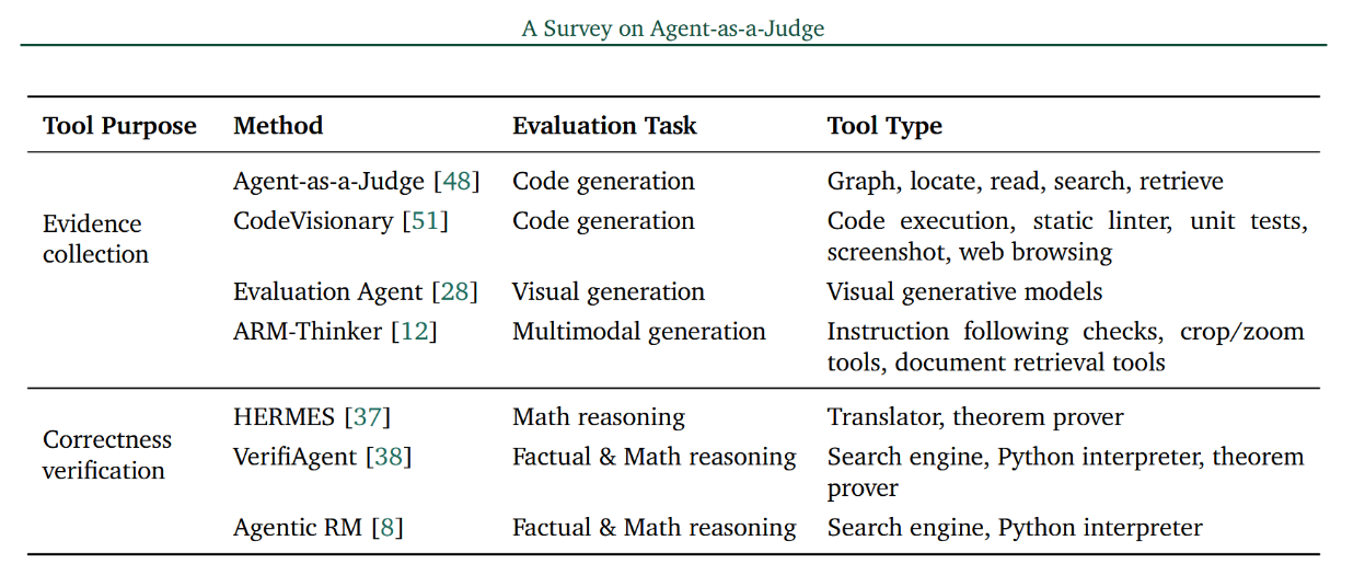 工具集成是智能体即评委框架的一项关键能力,使评委能够基于外部证据和显性核查进行评估。如表1所示,现有方法可根据工具使用的目的,归类为证据收集与正确性验证两类。