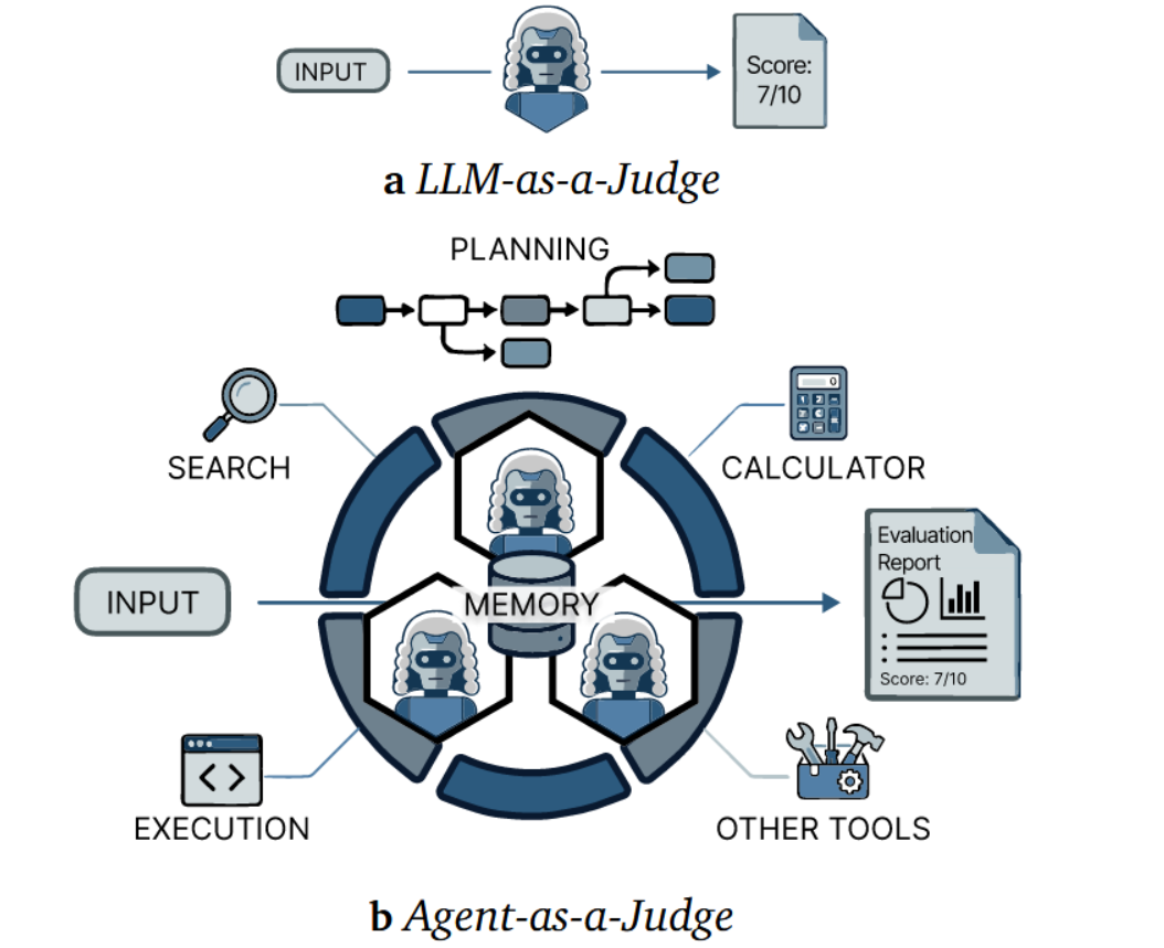 图1:LLM即法官(1a)与智能体即法官(1b)的对比。前者执行直接的单次评估,而后者利用规划、记忆和工具增强能力以实现更优的评估。