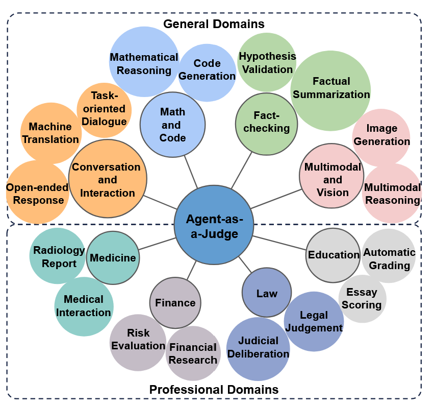 基于上述方法,本节阐述了智能体即评判员方法在不同评估任务中的应用。如图4所示,我们将代表性应用组织为两组:通用领域与专业领域。