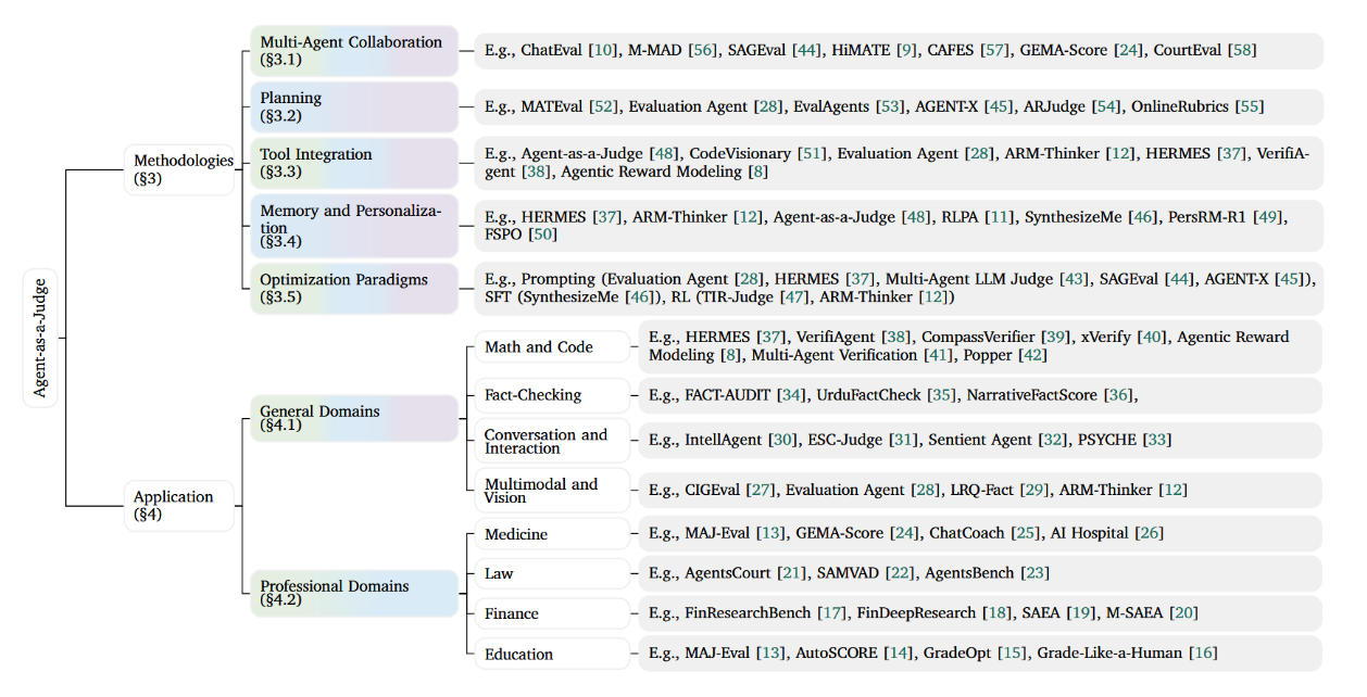 图2:作为评判者的智能体分类体系,涵盖方法论(§3)与应用领域(§4)。背景渐变色调展示了从"流程化"到"反应式",再到"自主演化"的发展阶段覆盖范围。