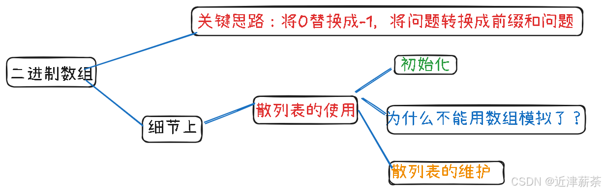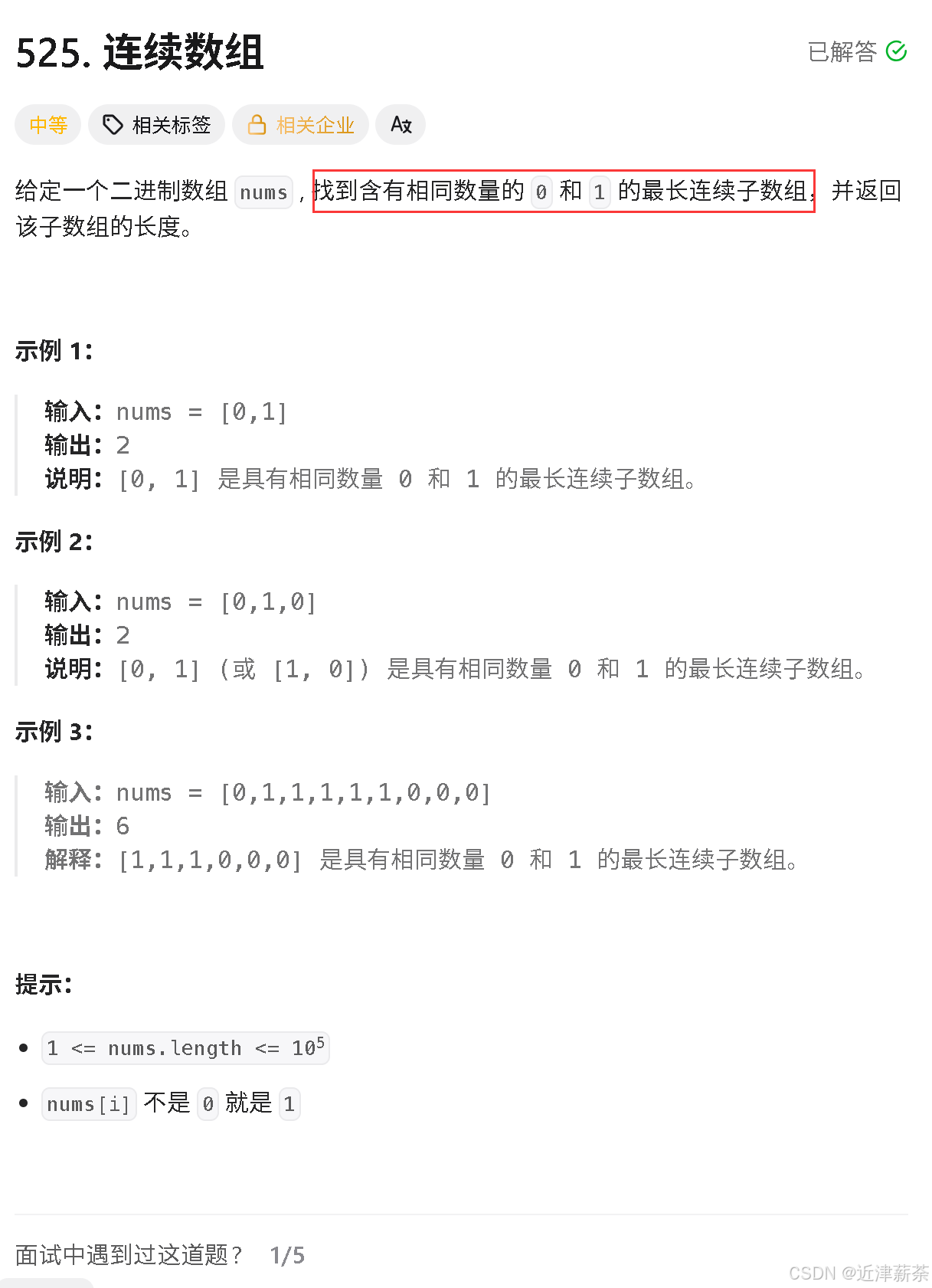 本题可以把数组中的0改成-1如果子数组中0和1个数相同的话,那子数组的元素之和就是一个定值0,问题就被转化成了:求和为0的最长子数组长度